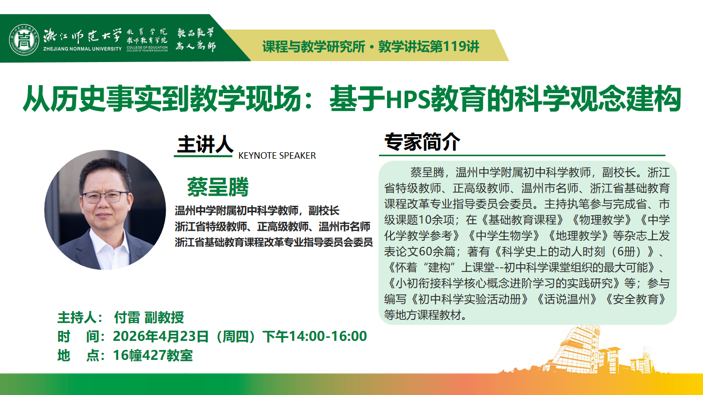 【讲座预告】蔡呈腾副校长主讲敦学讲坛第119讲:《从历史事实到教学现场:基于HPS教育的科学观念建...