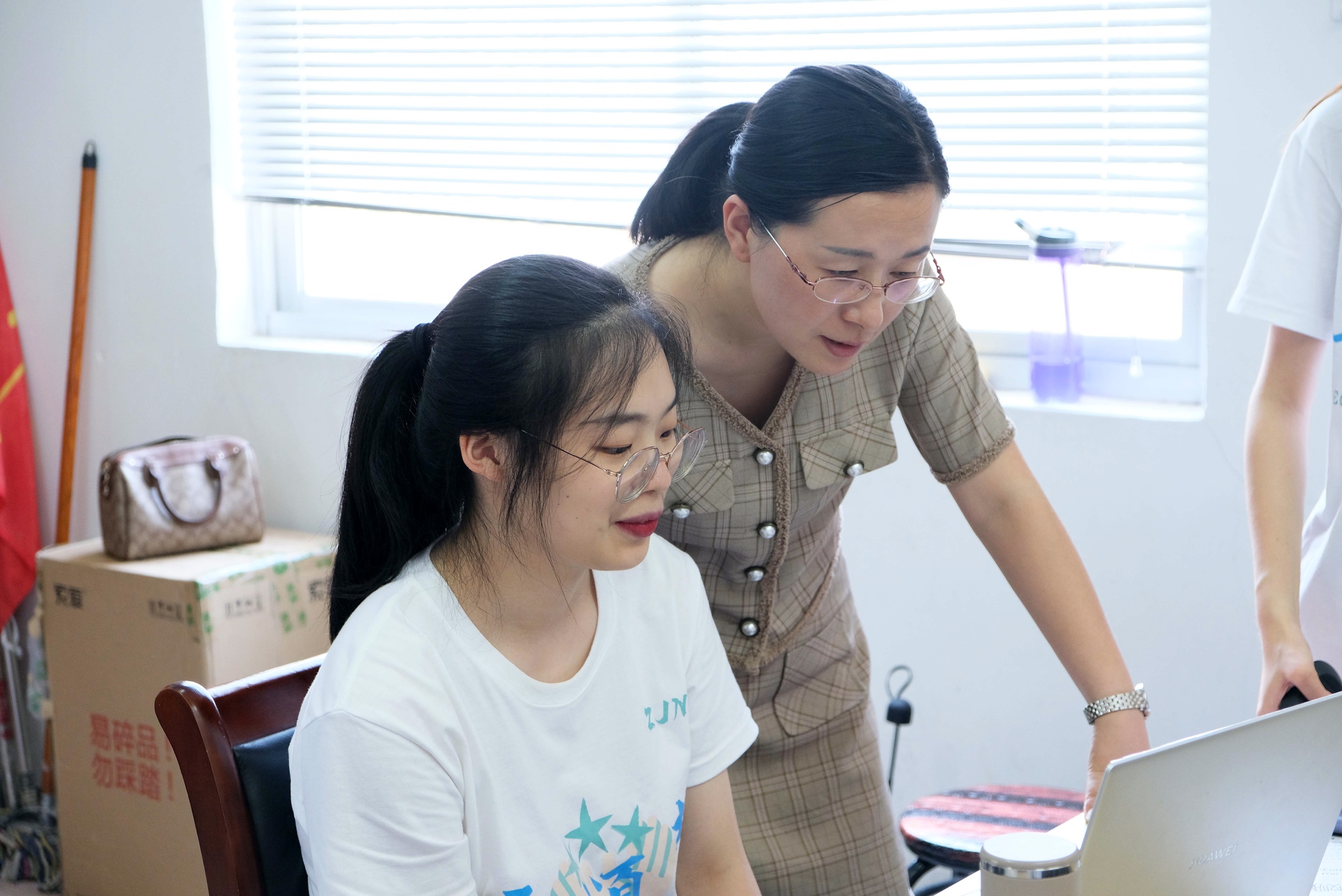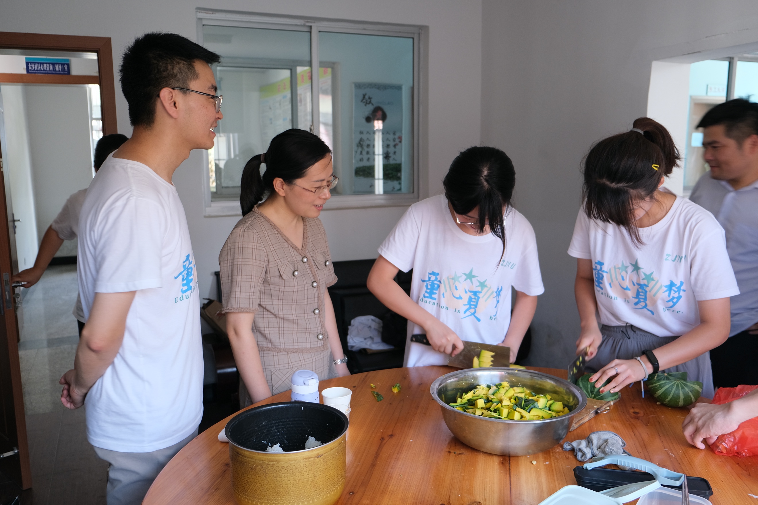 会议结束后,叶老师来到了办公室和后勤厨房,了解和指导同学们在课堂背后的各项工作。此时,办公室里的同学们正在电脑前进行着紧张的备课、外宣、调研、活动策划等工作,厨房里的同学们则展示起了娴熟的切菜技能。