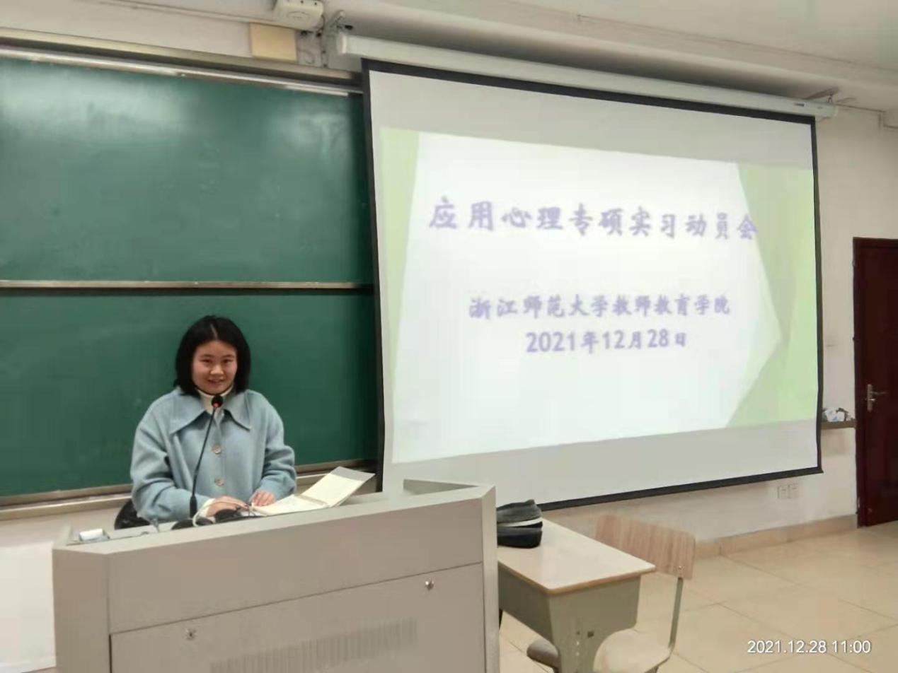 为更好地营造应用心理专业学位研究生重视实践实习的氛围以及强化应用心理专硕实习实践规范管理,促进学生认识实习的意义和熟悉实习的章程,应用心理专硕学位点于2021年12月28日上午在5幢101召开2020级应用心理专硕实习动员会。教师教育学院副院长钱旭升老师、研究生办主任刘冬仙老师、学位点负责人陈海德老师以及2020级应用心理全体专硕同学出席动员会。