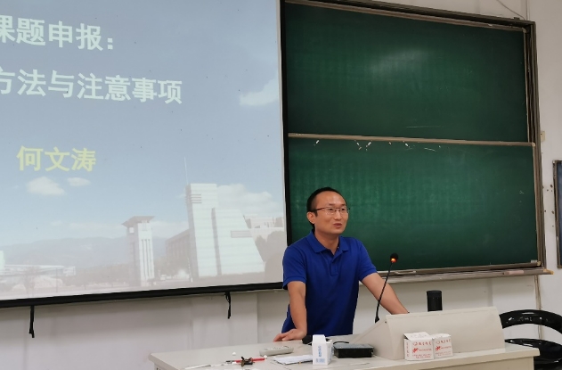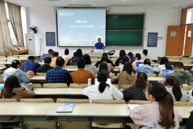 “为什么要申报项目?”活动伊始,何老师首先向同学们抛出这个问题,并从学生科研能力提升和教师专业发展两个方面阐述了项目申报的重要性。随后,何老师从课题申请书的组成部分及要求、论证方法和课题申报的注意事项三个方面详细讲述了课题申报的整个流程。其中,何老师重点讲述了课题组成部分的论证方法,并从选题依据、研究内容、思路方法、创新之处、预期成果、参考文献六大点出发,通过具体案例和个人申报的经验详细阐述了各部分的注意要点。