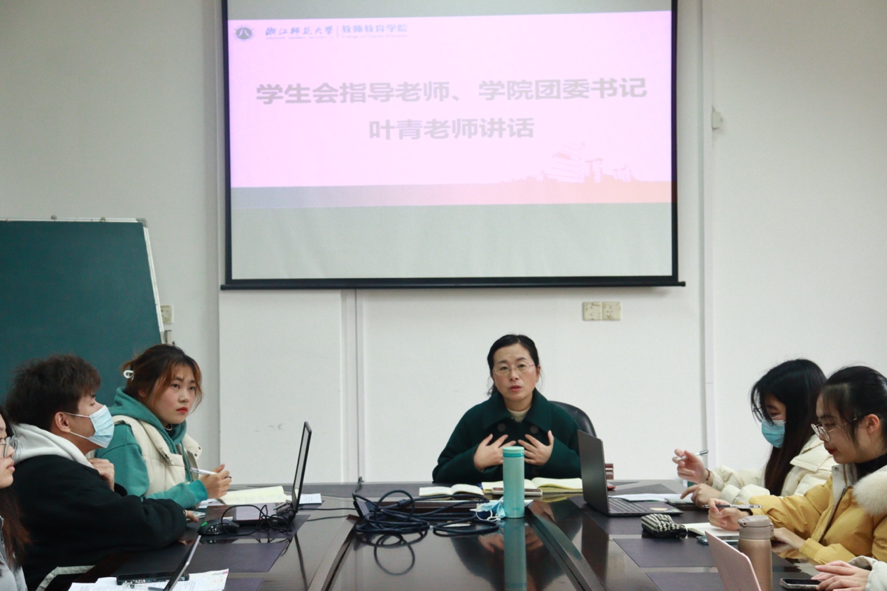 为学习贯彻党的十九届六中全会精神,进一步增强学院团委学生会成员的责任意识和团结协作能力,在本学期末总结经验和工作成效,明确工作目标,树立工作标杆,12月17日,教师教育学院团委学生会学期述职大会于17-225教室顺利举行。根据疫情防控要求,本次大会分为线下线上同时开展,学院团委书记兼学工办主任、院学生会指导老师叶青老师,各部门第一负责人及主席团各成员线下参与会议,部门全体负责人则在线上参会,本次会议由院学生会主席团成员蒋靓主持。