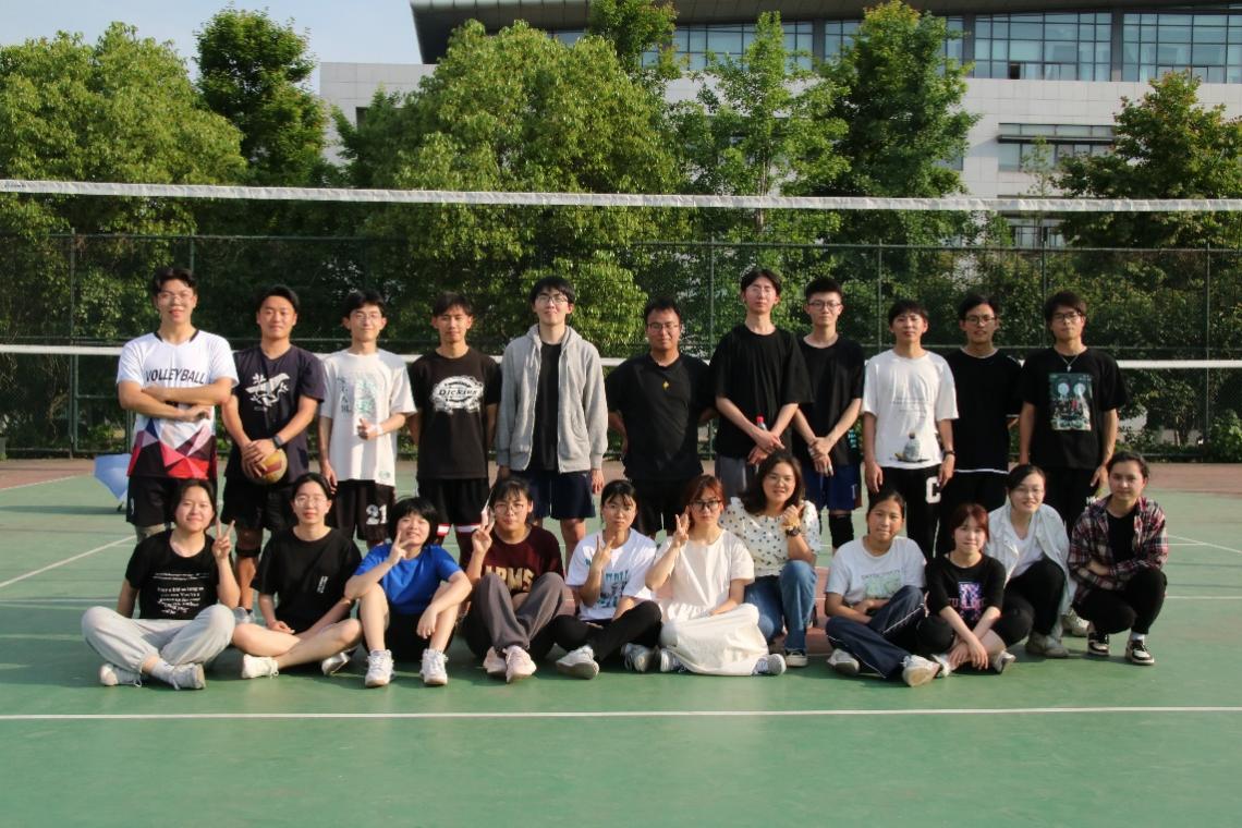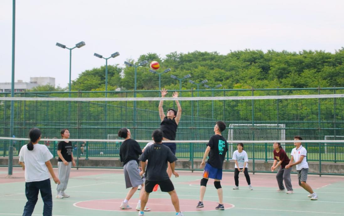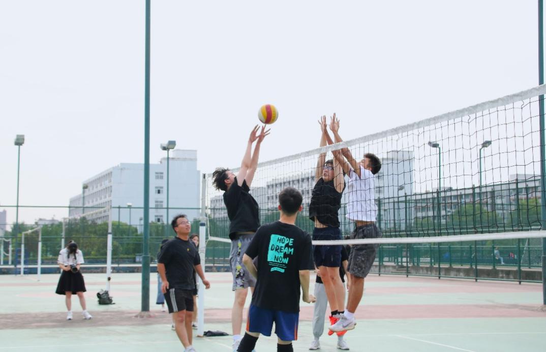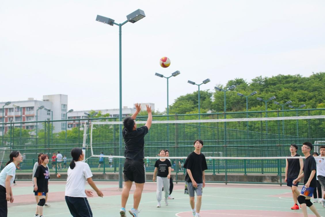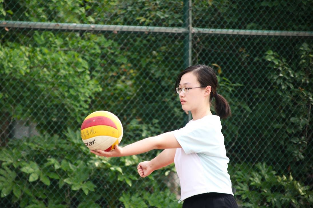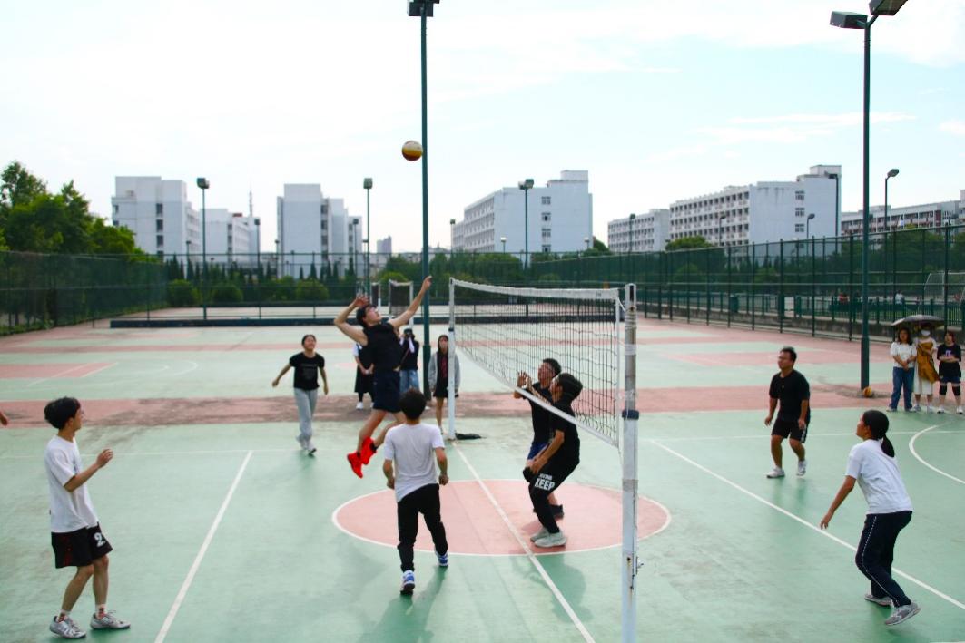 下午三点左右,两个学院的球队队员们就已在排球场上热身,为队员们加油打气的啦啦队也陆续到场。随着哨声一响,比赛正式开始!