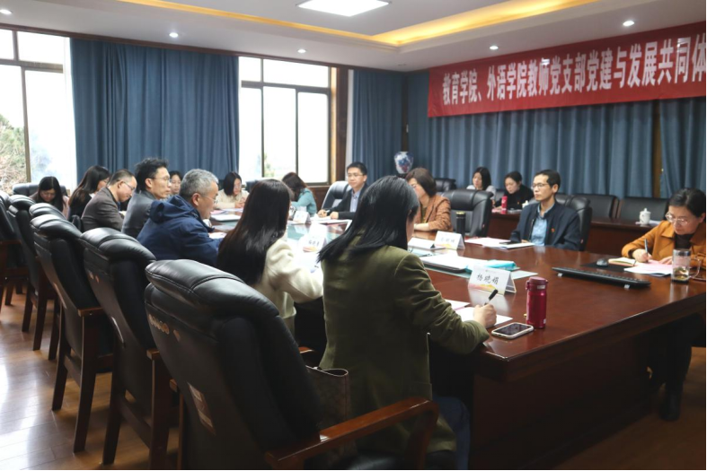 外国语学院党委书记项伟指出,教育学院、外语学院教师党支部携手共建党建与发展共同体,联袂画出事业高质量发展的同心圆,可以说恰逢其时、很有意义。通过组建横向多跨的党建与发展共同体,把促进学院内涵式发展、学科学位点建设等作为落脚点,不断激发党建工作活力,真正把党的政治优势、组织优势转化为学院的发展优势,大有可为、大有作为。项伟提出“五联五强”的意见:一是理论联学强党性。结合“三会一课”,定期召开联学会议,确定主题发言,聚焦某一理论问题或现实问题深入学习交流。二是队伍联育强引领。一月一主题,月月有交流,对标优秀榜样,引导支部党员业务能力不断提升。三是活动联办强凝聚。建立“共享主题党日”轮办机制,联动开展“我为师生办实事”活动,引导党员强化服务意识、争创党员先锋。四是品牌联创强特色。坚持特色驱动,以品牌思维抓党建,通过教育、外院的党支部强强联合,突出展现党建工作的教育味、外语味、数字味。五是发展联手强内涵。以上述系列活动推动支部党员在学术方面取得长足进步,带动系部老师共同发展,最终实现双向奔赴,形成促进学院事业发展的强大合力。