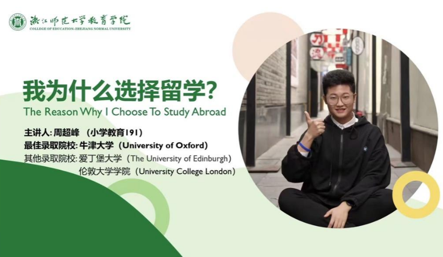 会议邀请了小学教育191班周超峰同学就其斩获牛津大学offer进行经验分享,引导有留学意愿的同学可以早做准备,把握每一个学期绩点,利用实习和科研丰富自己,斩获海外高校offer。周超峰鼓励学弟学妹们勇于挑战自我,走出舒适圈,感受不一样的学习生活。