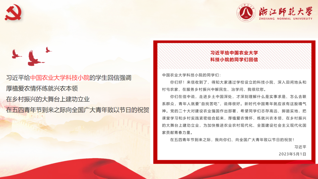 在学习习近平总书记给中国农业大学科技小院的同学们的回信精神中,俞书记强调新时代中国青年就应该有这股精气神,作为一名教育工作者,我们要努力培育青年人的这种精气神,要以扎实学识、仁爱之心引领青年、服务青年、融入青年,用党的科学理论武装青年,用党的初心使命感召青年,做青年朋友的知心人、青年工作的热心人、青年群众的引路人。他希望教育学子厚植教育情怀,练就育人本领,在科教兴国的大舞台上建功立业,为加快推进中国式教育现代化,全面建设社会主义科教强国贡献青春力量。
