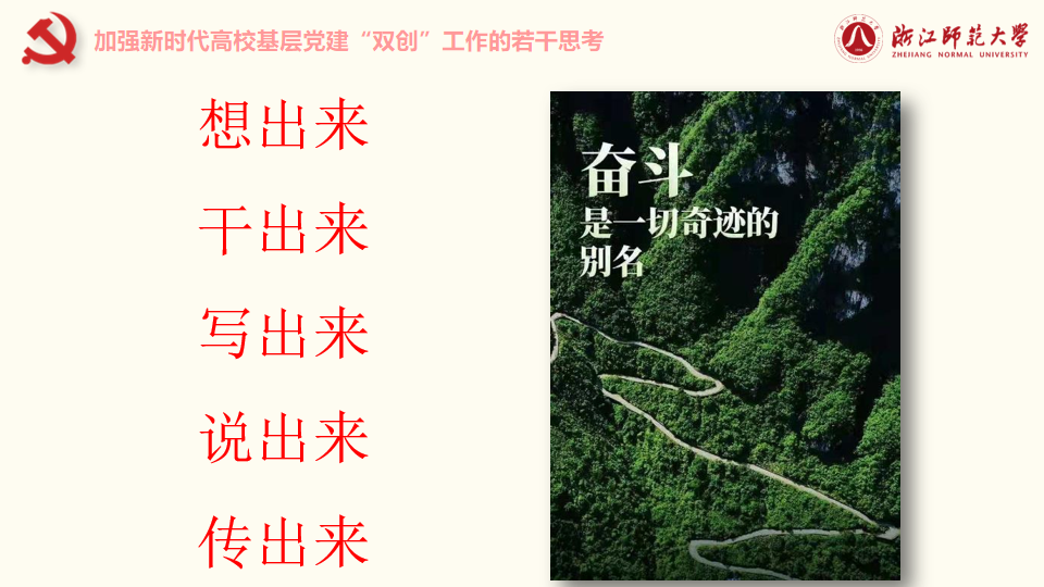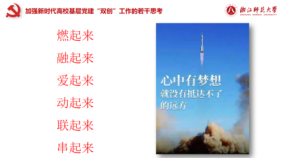 会上,俞明祥书记围绕“高校基层党建“双创”工作的理论逻辑”“高校基层党建“双创”工作的现实价值”“高校基层党建“双创”工作的他山之石”“高校基层党建“双创”工作的浙师实践”四个方面展开汇报。