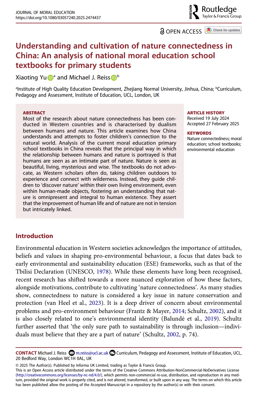 近日,教育学院俞晓婷副教授在期刊《Journal of Moral Education》(JME)刊发署名文章《中国对自然联结理解与培养:基于小学道德教育教材的分析》。