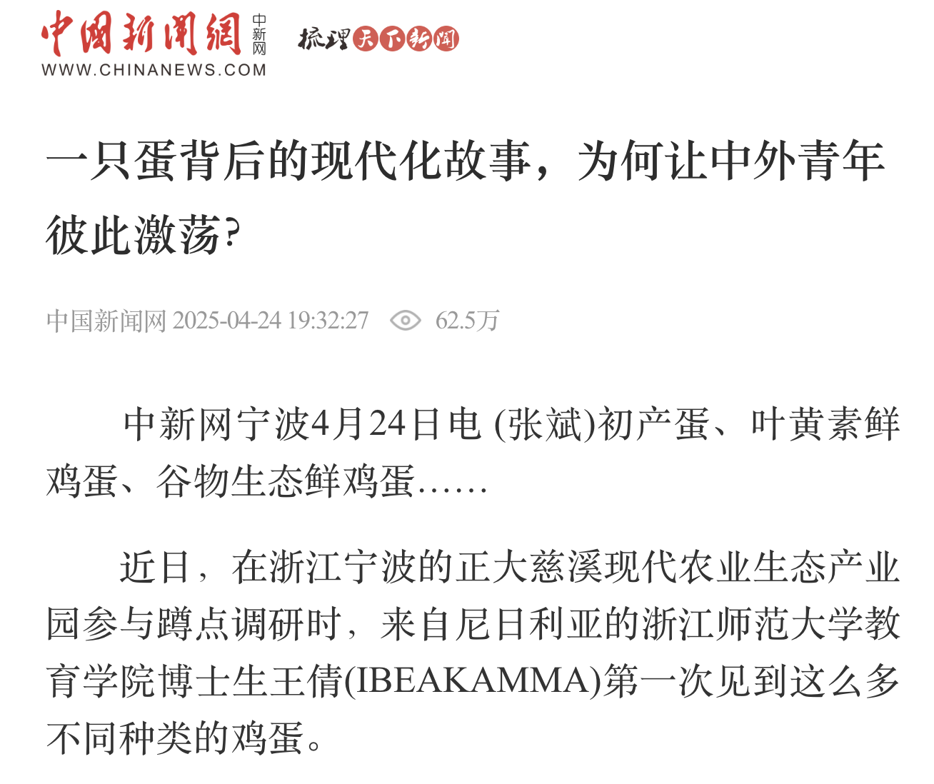 4月24日,中国新闻网、浙江新闻频道报道我院尼日利亚籍博士生王倩(IBEAKAMMA)参与“Hi China!我的中国故事”前期调研活动。她与浙江省“8090”和“00后”新时代理论宣讲团成员展开结对,围绕新质生产力,在宁波走访前湾新区、慈溪市并蹲点调研。
