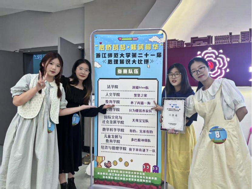 5月11日,浙江师范大学第二十一届心理知识大比拼决赛落下帷幕。在这场智慧与创意的比拼中,由教育学院王欣婷、薛羽涵、张芯瑜、章文煊组成的“养了两猫一狗”队获得二等奖。此外,小学教育2303班洪诗睿获评校“2024-2025学年年度十佳心理委员”荣誉称号。