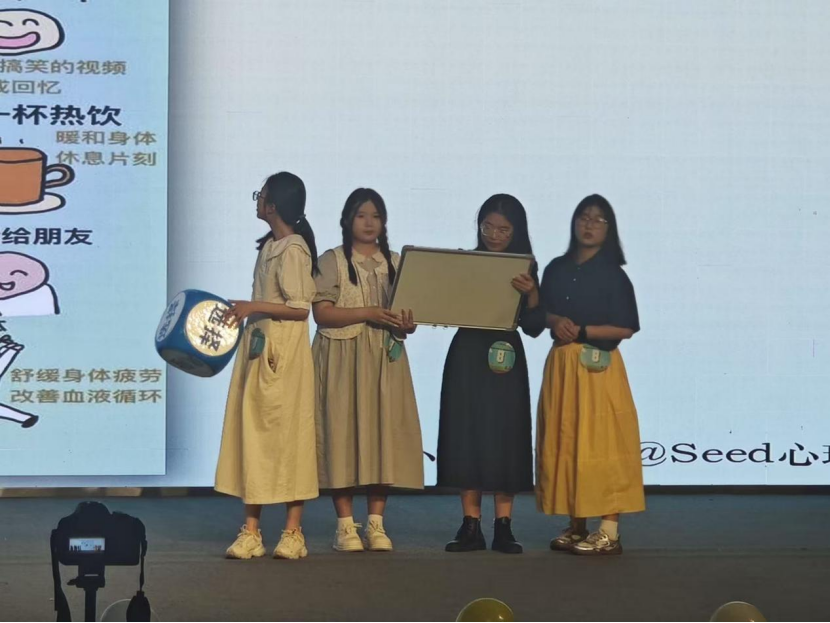 在 “演心绎识” 环节,“养了两猫一狗”队抽中 “秩序之外” 主题,以原创童话短剧《偏航也没关系》在现场精彩亮相。剧目以白雪公主为主角,将系统脱敏法、灾难化思维等心理学知识巧妙融入剧情,通过鲜活的童话叙事,展现对“秩序”的突破与思考。故事以在“不确定”中寻得“确定感”的温暖结局收尾,于奇幻情境中诠释了在秩序之外亦能成就美好的深刻内涵。经现场评审综合全场表现评分,团队最终斩获二等奖。