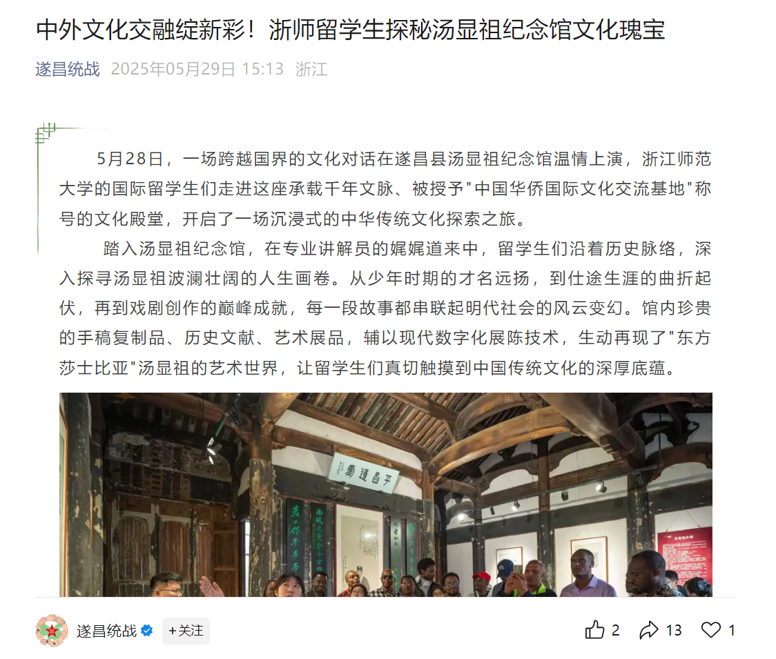 5月27日至29日,浙江师范大学商务部援外学历学位教育(比较教育学硕士)项目2023级留学生走进浙江丽水遂昌,开启为期三天的社会实践与文化体验之旅。活动融合教育交流、历史探寻与生态实践,立体展现浙西南小城的人文底蕴与发展活力,受到遂昌新闻、遂昌统战、学在遂昌等官方媒体账号的关注与报道。