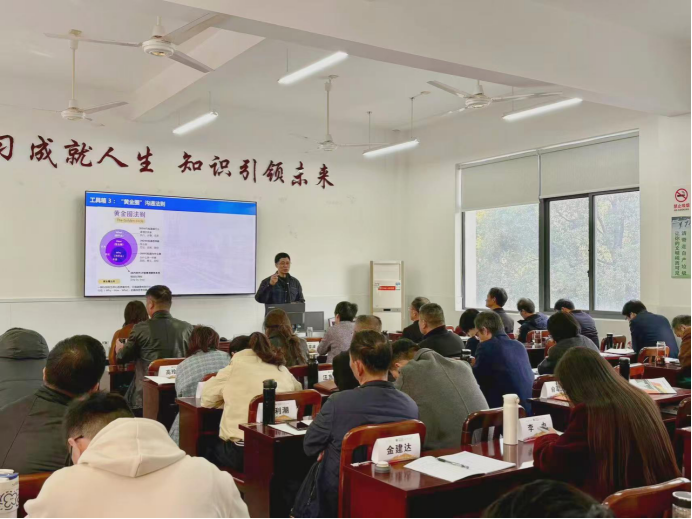 28日上午,宁波高新区实验学校党总支书记、正高级教师罗树庚围绕《优化管理助推教育高质量发展》展开讲授。课程聚焦四大实践路径:一是以结构变革推动课堂转型,构建“学为中心”的课堂,推行“读、写、读、练”教学范式;二是以项目驱动教研组发展,分享“玩转数学”等特色项目经验;三是以课程引领学校发展,构建“玩学课程”体系;四是以教科研促进教师成长,从情怀、课堂、阅读、研究等多方面为教师赋能。课程还从管理者的表达、设计、反思与格局等方面分享了实践智慧,强调以教育家精神引领教师发展,筑牢教育高质量发展的根基。
