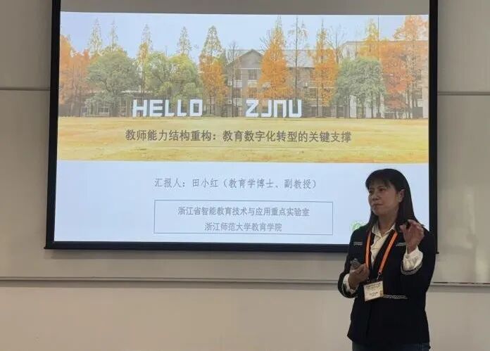 田小红副教授作《教师能力结构重构:教育数字化转型的关键支撑》报告。她从教育数字化的四大需求切入,借鉴组织行为学视角,提出未来教师应具备课程教学、人机协同、有效德育和自我成长四类核心能力,为推进教育数字化转型提供理论框架与实践路径。