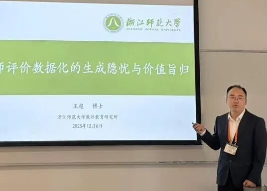 王超博士作《教师评价数据化的生成隐忧与价值旨归》报告。他指出数据化评价提高透明度与效率,但同时引发问责透明性悖论、数字异化与去专业化风险。报告倡导构建“数据为用、价值为善、治理为要”的评价体系,以促进教师主体性发展与制度优化。