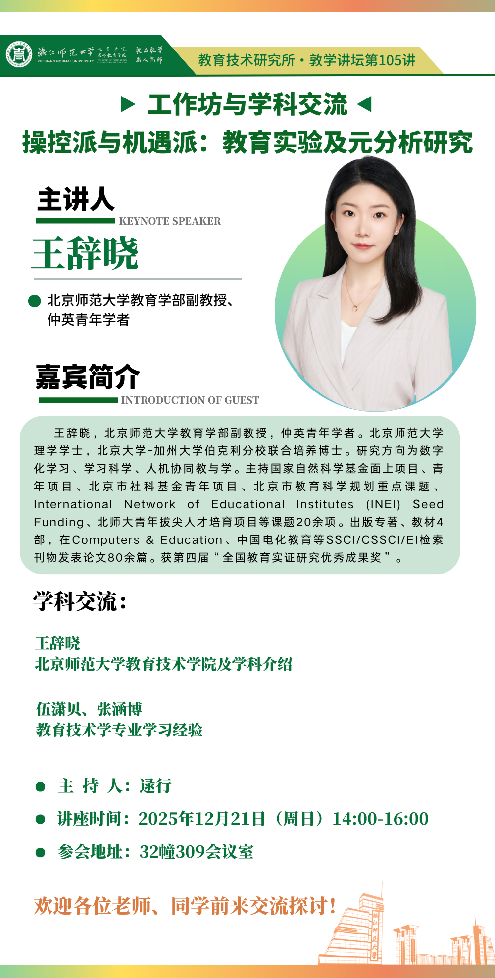 12月21日(周日)下午14:00,王辞晓副教授将在32幢309会议室,主讲教育技术研究所系列讲座暨敦学讲坛第105讲《工作坊与学科交流——操控派与机遇派:教育实验及元分析研究》。
