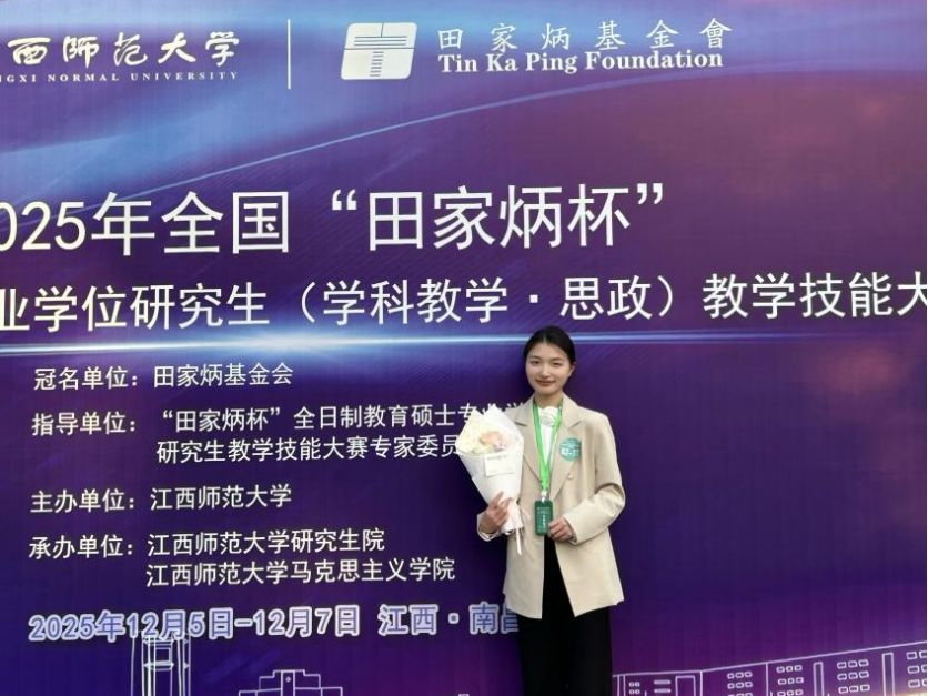 习宾旭和胡瑶琦同学在比赛现场 学科教学(思政)专业共吸引了来自全国98所高校的254名选手晋级决赛,经过激烈角逐,大赛共评出一等奖26名、二等奖51名、三等奖103名。我院学科教学(思政)学生王雪(指导老师:程力、张啸尘)获得三等奖,沈虹君(指导老师:程力)获得优秀教学设计奖。 王雪同学在比赛现场 沈虹君同学在比赛现场 现代教育技术专业共有来自87所高校的398名选手参与初赛,200名选手晋级决赛,最终产生一等奖20名、二等奖40名、三等奖80名、优秀教学设计奖56名、优秀指导教师奖50名。我院选派参赛的5名研究生全员晋级决赛,并在决赛中全部获奖,其中杨梦洁(指导老师:黄昌勤、黄琼浩)、张婉嫔(指导老师:韩中美)荣获二等奖,张婉露(指导老师:朱佳、李鸣华)、沈伊洁(指导老师:阮高峰)、沈雨欣(指导老师:方向)荣获三等奖。黄昌勤、韩中美老师荣获“优秀指导教师奖”。 张婉嫔、沈雨欣、杨梦洁、沈伊洁、张婉露在比赛现场 至此,我院各专业教育硕士本年度参与的全国“田家炳杯”全日制教育硕士专业学位研究生教学技能大赛完美收官,学生获奖共计30人次,指导教师获奖共计12人,是参赛5年以来取得的最好成绩。 全国“田家炳杯”全日制教育硕士专业学位研究生教学技能大赛是全国影响与规模较大的教学技能竞赛,由田家炳基金会冠名,全国教育硕士专业学位研究生教学技能大赛专家委员会指导,赛事旨在展示全日制教育硕士专业学位研究生的教学能力及培养院校的培养成果,交流研究生培养经验。 学院始终将高水平教学竞赛视为锤炼学生实践能力的重要平台,系统推进教育硕士教学素养的全面提升和人才培养模式的持续创新,在赛事中取得显著成效,不仅展现了学生扎实的专业功底,更是学院持续推进教育教学改革取得实效的鲜明例证,进一步彰显了学院育人工作的成果。未来,学院还将继续加强教育硕士综合技能训练,着力培养更多具备先进理念、扎实技能与教育情怀的优秀教师,为基础教育发展贡献更多力量。