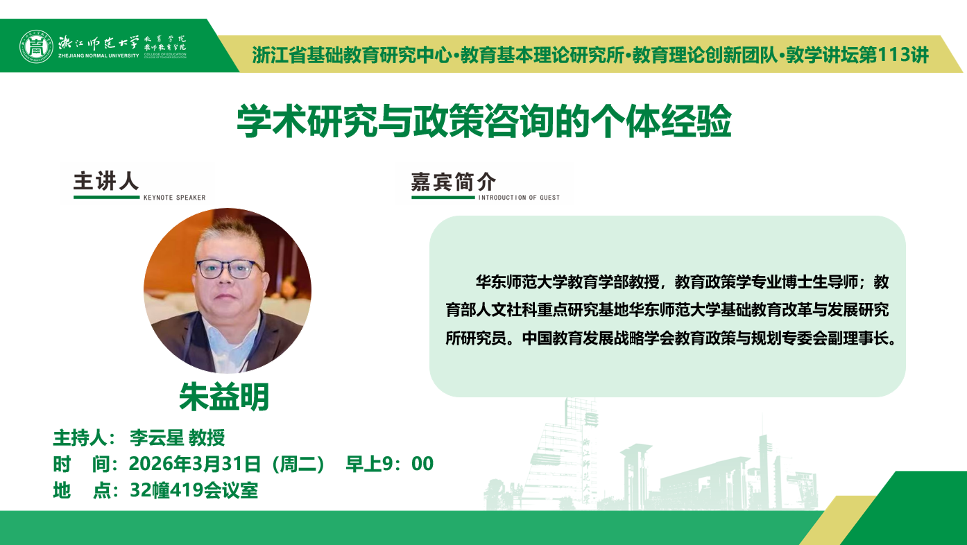 3月31日(周二)上午9:00,华东师范大学教育学部教授、教育政策学专业博士生导师、教育部人文社科重点研究基地华东师范大学基础教育改革与发展研究所研究员朱益明将在32幢419报告厅,主讲浙江省基础教育研究中心、教育基本理论研究所、教育理论创新团队系列讲座暨敦学讲坛第113讲《学术研究与政策咨询的个体经验》。主持人为李云星教授。