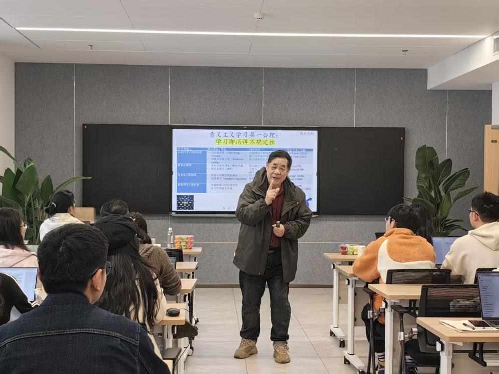 在核心演讲环节,祝智庭教授打破传统的线性认知,阐释了意义主义学习的两大公理——“学习即消弭不确定性”与“成功的学习滋生更多新的不确定性”,将学习定义为动态的“生机—迭代”过程。为了使高深理论通俗易懂,他在理论阐释中借助富有东方美学意蕴的“折扇哲学”,并结合AI大模型“豆包”生成文本的案例,形象说明了“意义涌现”的生成机制。同时,他通过“苏格拉底圆圈”的隐喻,生动揭示了“知之愈多,其惑愈广”的认知规律,引发在场师生的广泛共鸣。