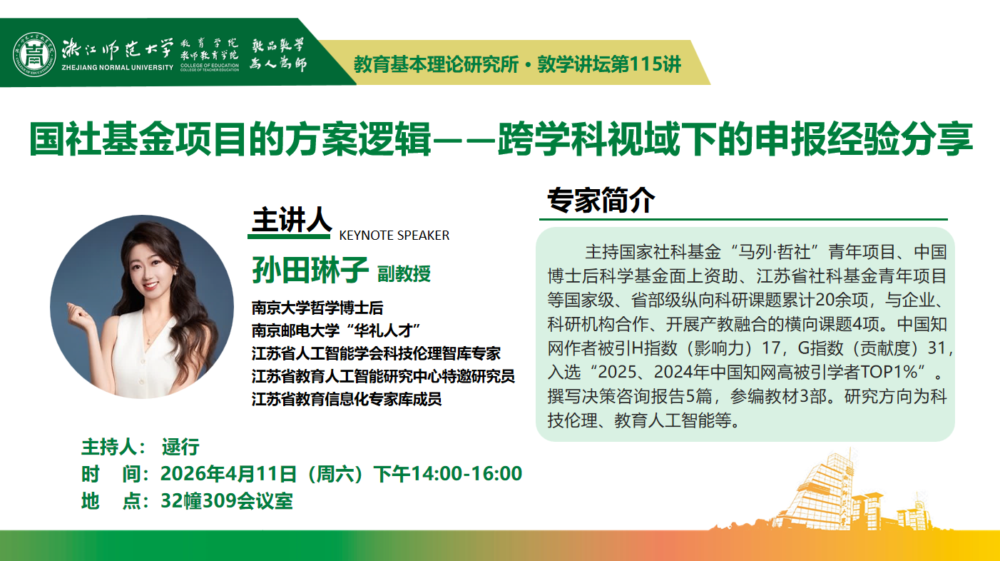 4月11日(周六)下午14:00-16:00,南京邮电大学“华礼人才”、江苏省人工智能学会科技伦理智库专家、江苏省教育人工智能研究中心特邀研究员孙田琳子将在32幢309会议室,主讲教育基本理论研究所系列讲座暨敦学讲坛第115讲《国社基金项目的方案逻辑——跨学科视域下的申报经验分享》。主持人为逯行副教授。