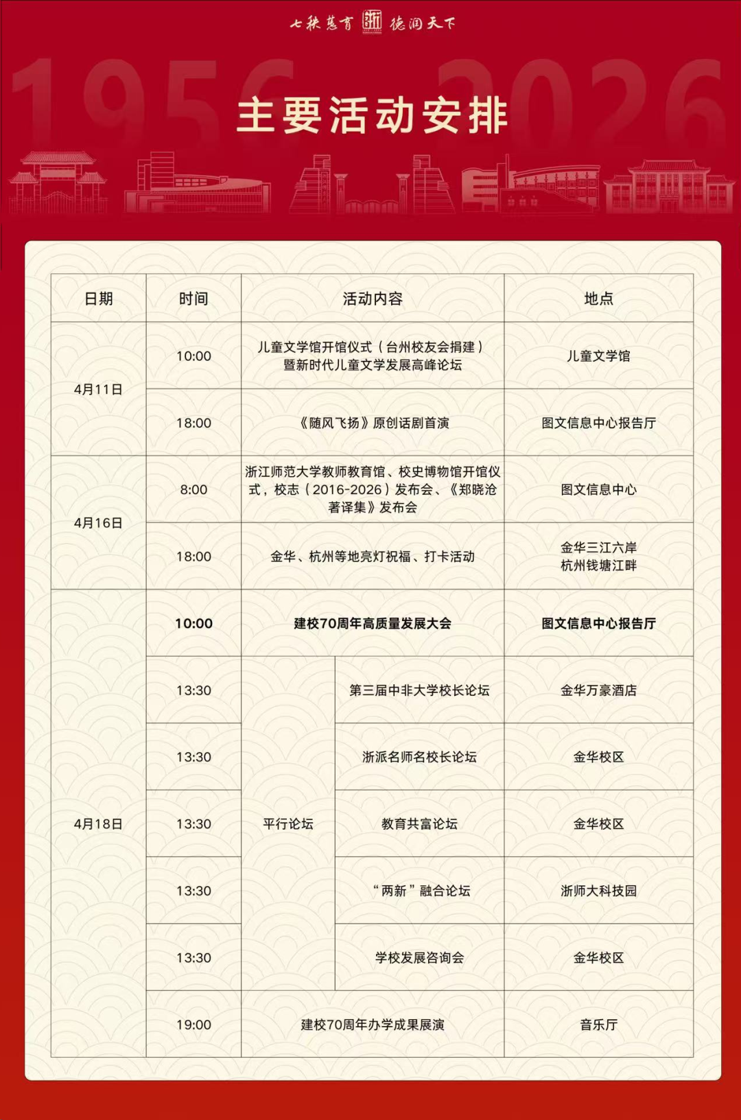 浙江师范大学70周年校庆主要活动安排