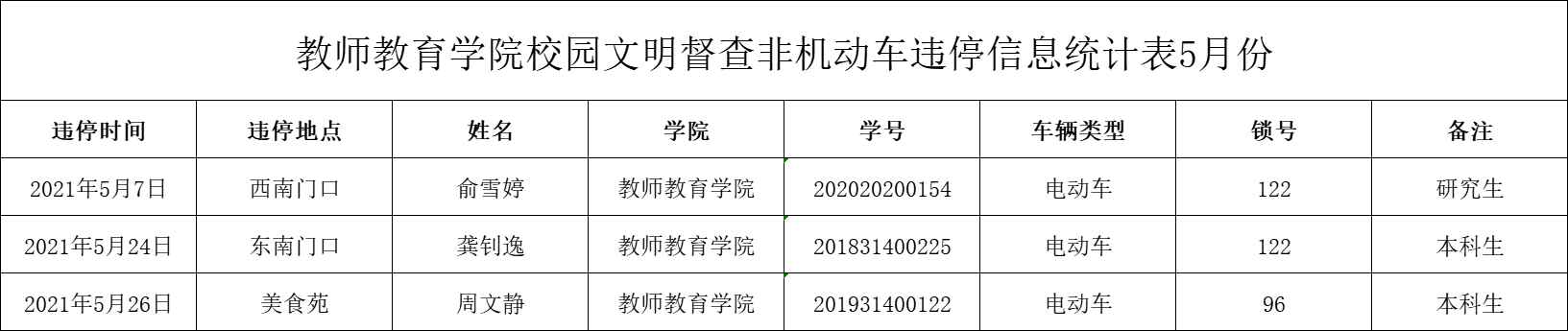 教师教育学院2021年5月份非机动车违停情况通报公示