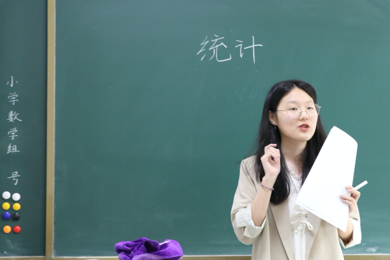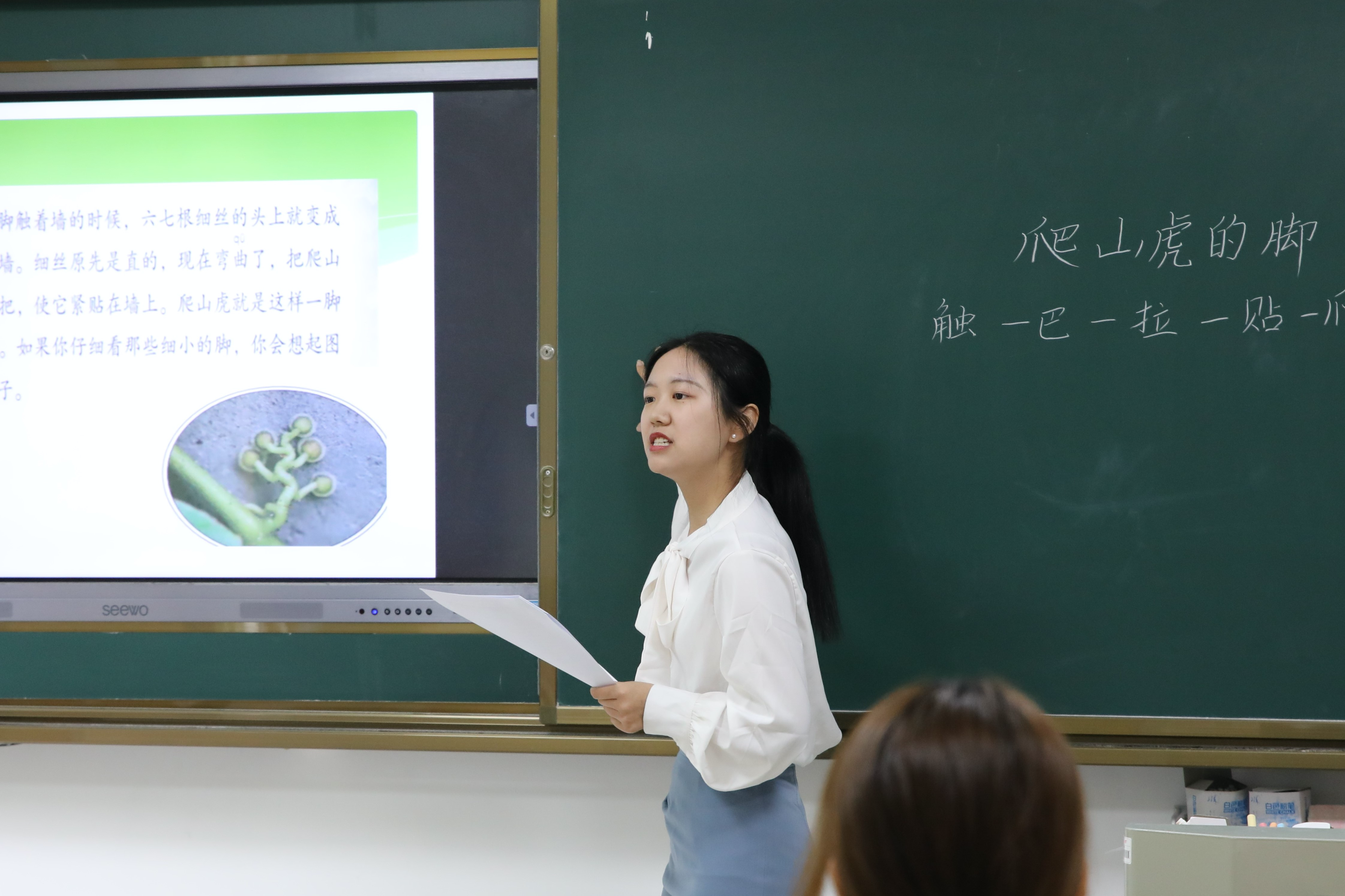 模拟上课环节,选手们的表现同样精彩。小学数学组的2号选手翁彬彬通过套圈游戏引入课堂内容,激发学生的学习兴趣,设计的环节层层深入,逐步带领学生对平均数有明确的概念。教育技术组的5号选手黄蕊则细致地为同学们讲解了动画的设计。小学语文组的3号选手邱亦可带领学生仔细研读《爬山虎的脚》第四段,分析其中的动词,让学生进一步感知文章的魅力。