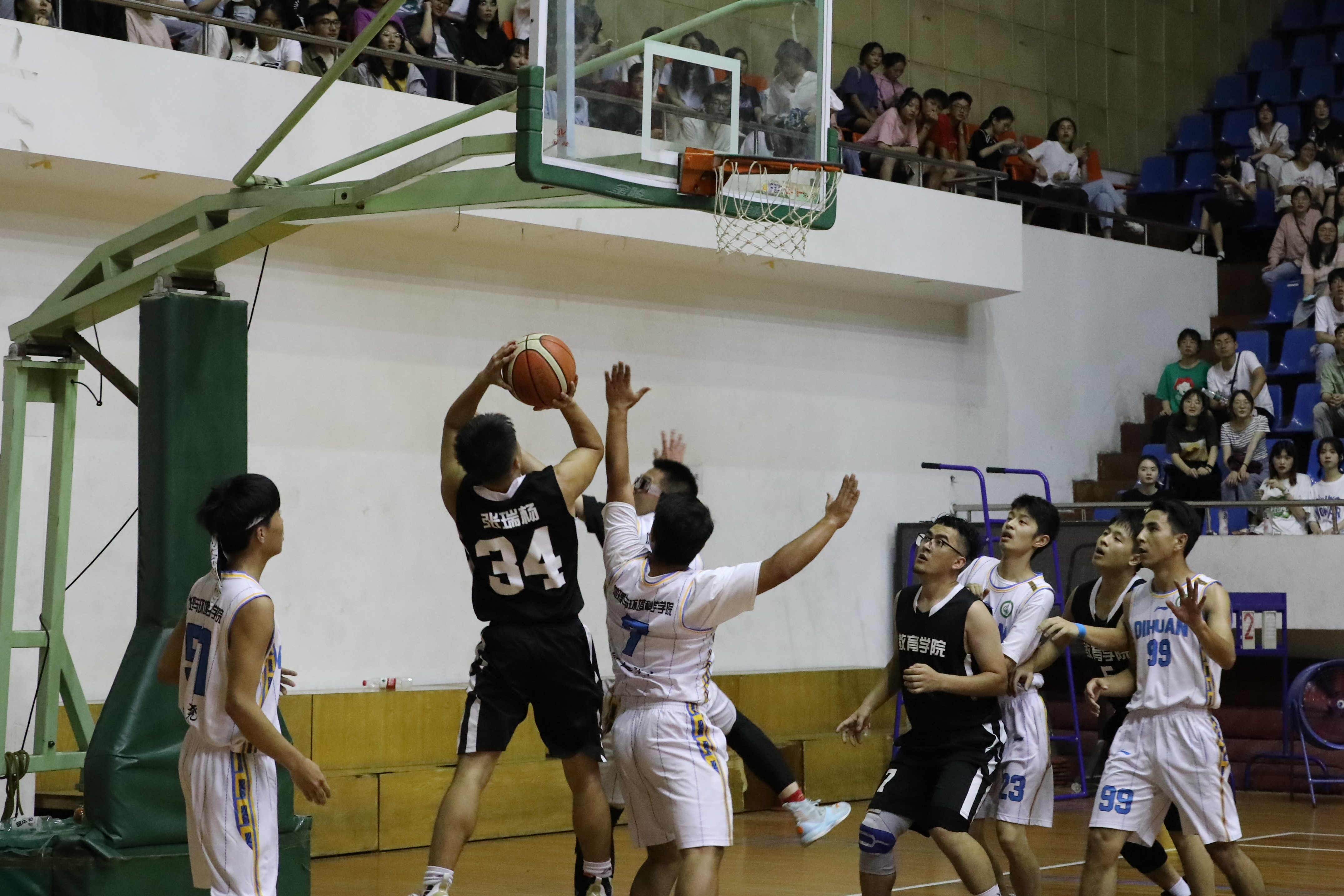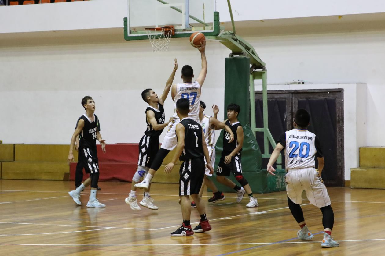 随着裁判一声哨响,比赛双方展开了激烈的对决,众多教院学子也纷纷到至现场,为我院的运动健将们加油打气,呐喊助威。我院篮球健将们在球场上努力拼搏、配合默契,24号艾沙抢断快攻动作迅速;3号张金鑫面对对手强硬防守突破上篮投进三分,取得教育学院校男子篮球赛决赛首分;8号包立松串联全场,多次抢断以及送出助攻……教院球员们的一个个精彩表现博得观众阵阵喝彩。在欢呼声中,队员们乘胜追击,依靠防守与快攻,半场就建立了较大优势。