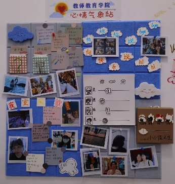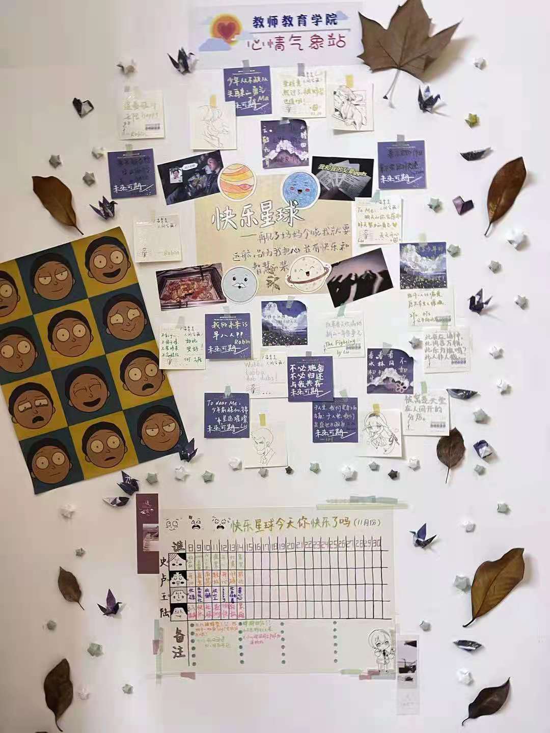 初阳F2-212寝室的心情气象站则以天空蓝为主色调,并点缀上了许多颗星星,意为四位成员在教育星空下的熠熠生光。心情气象站上展示了各位寝室成员们的大头贴,将每天的心情绘制成一周的周报,更加直观地展示一周中成员们心情起伏的变化。此外,寝室里还贴心地设置了心灵驿站,用一封封温柔的书信,一张张承载鼓励的小卡片的方式来互相交流情感,解决对方问题。