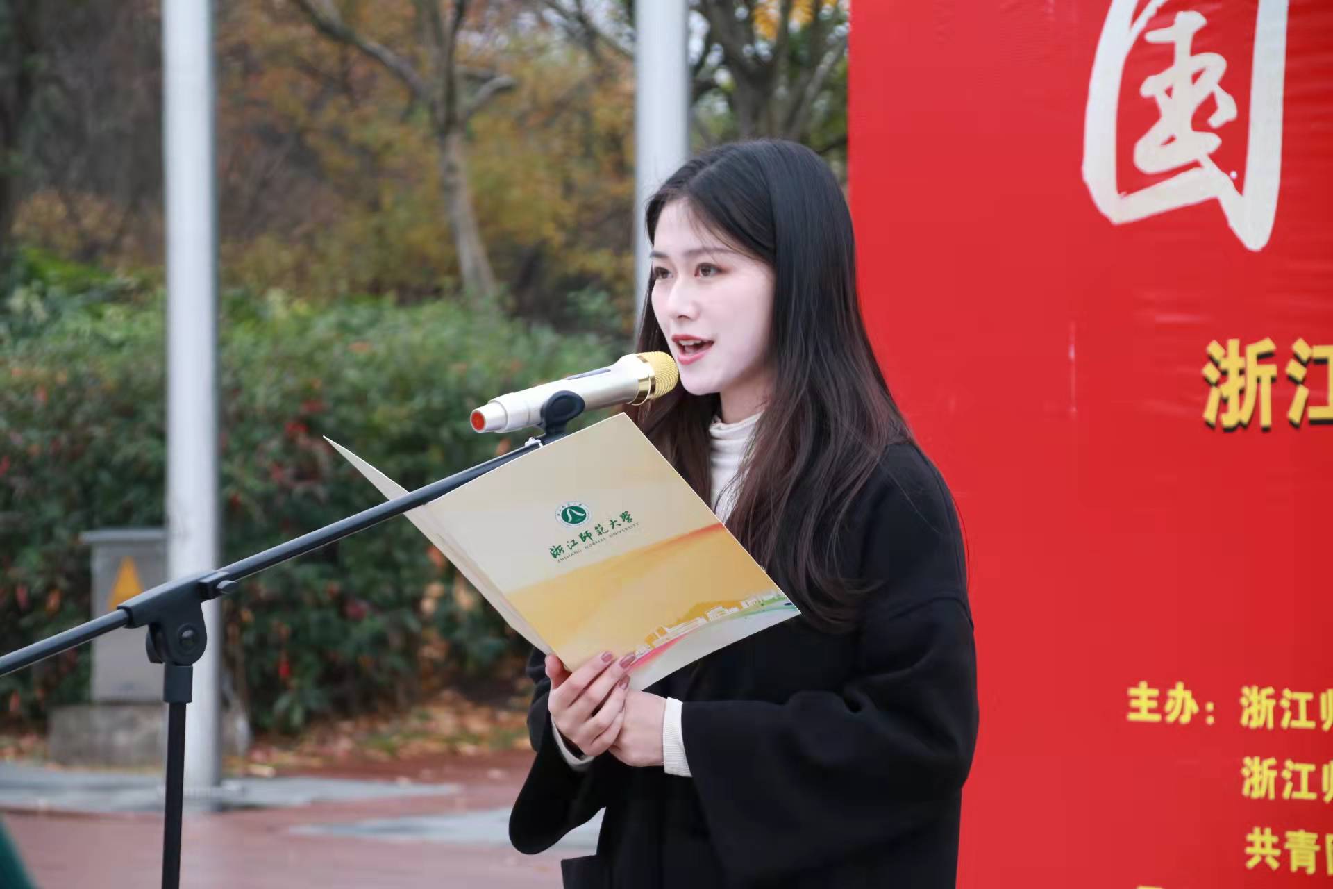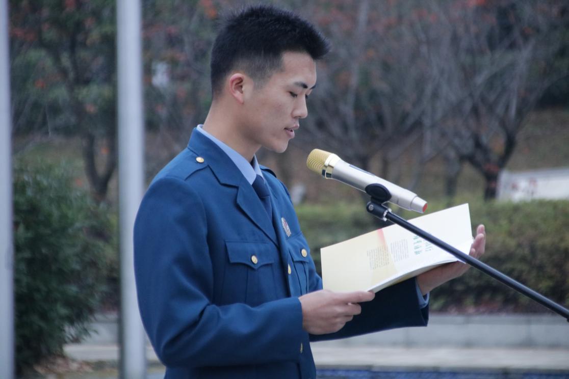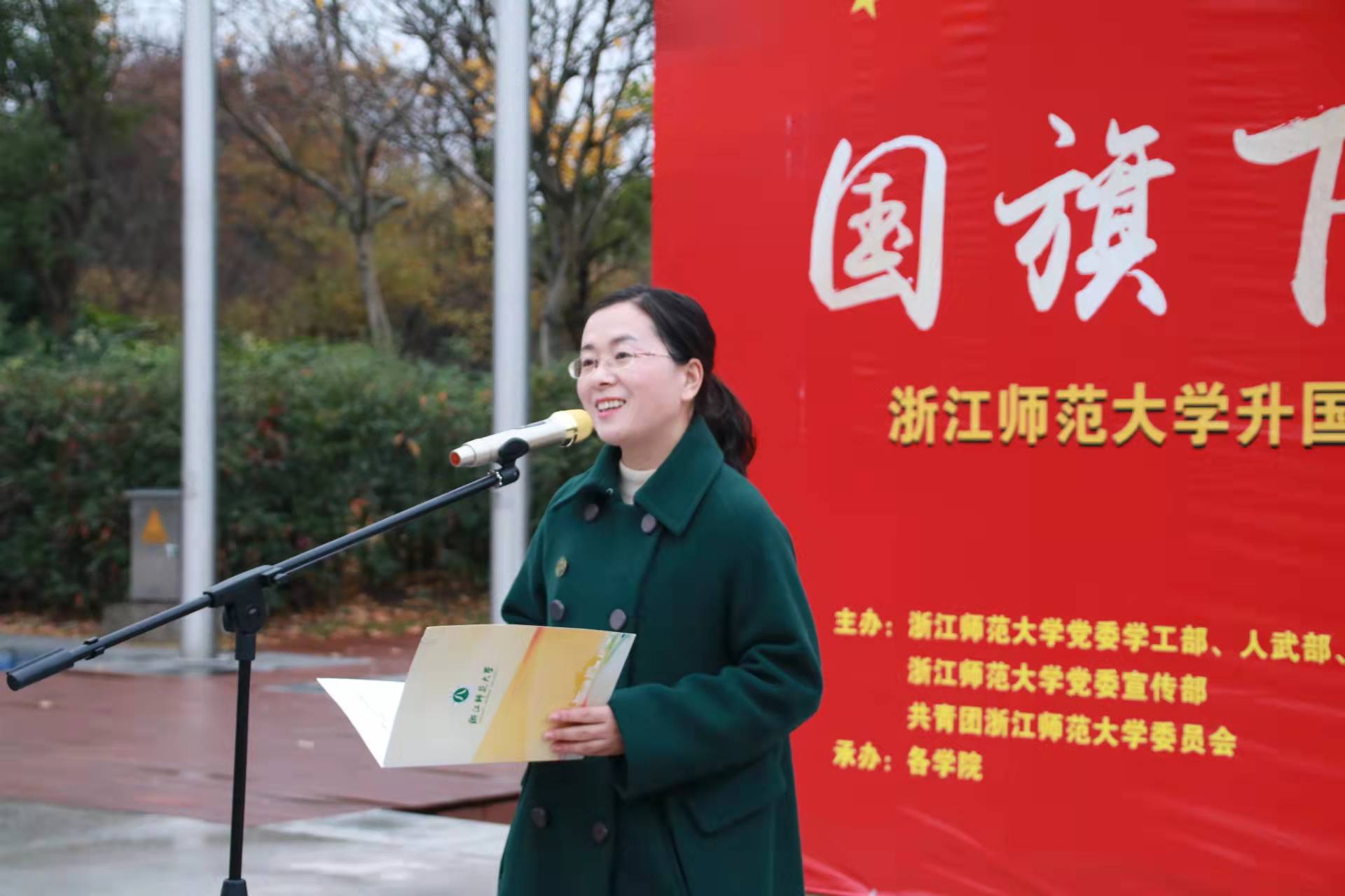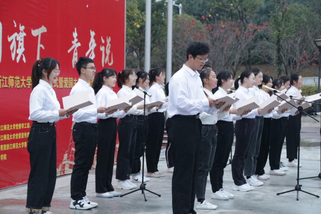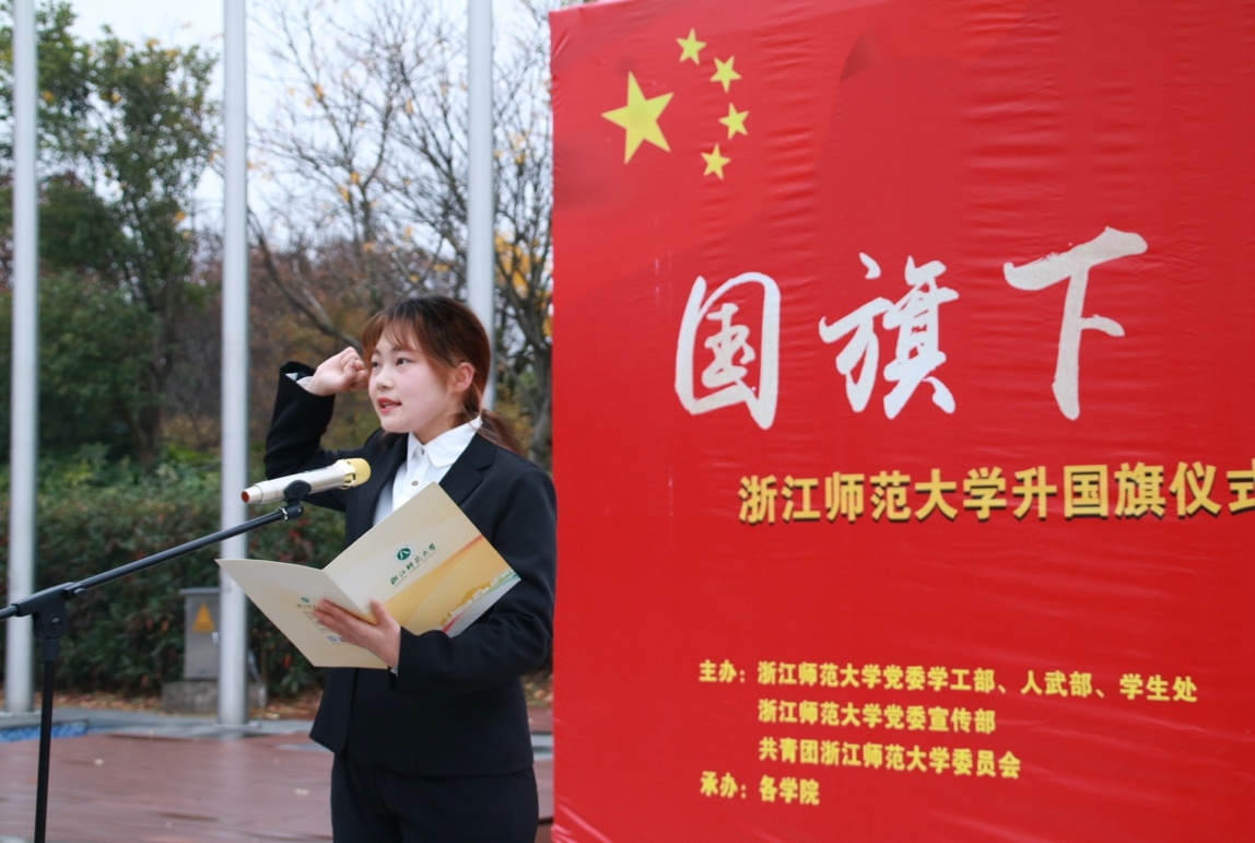 强军梦,教育梦,都可以在浙里灿烂绽放。退役军人研216班姚佳波和19级小学教育本科生、国家奖学金得主高一禾作为学生代表,在国旗下发言。