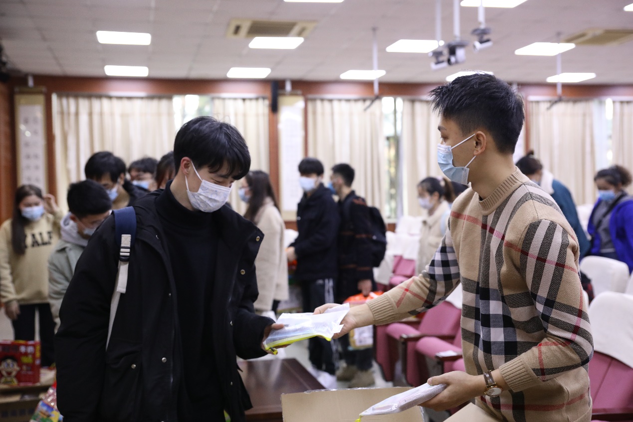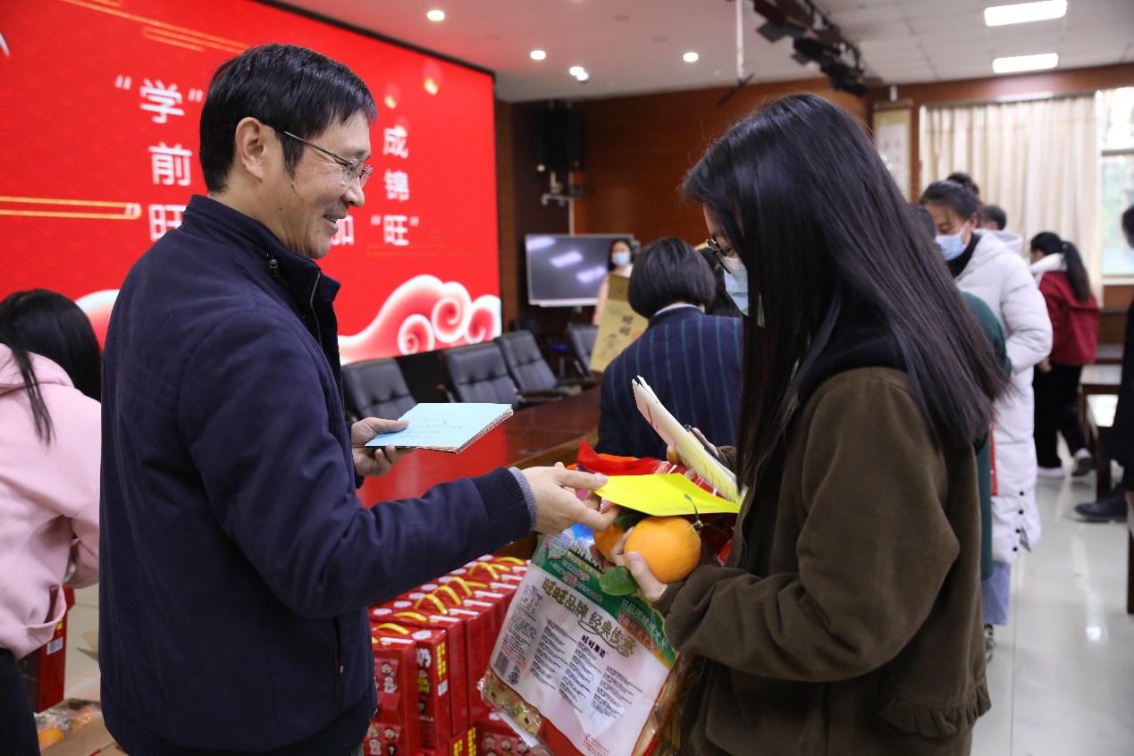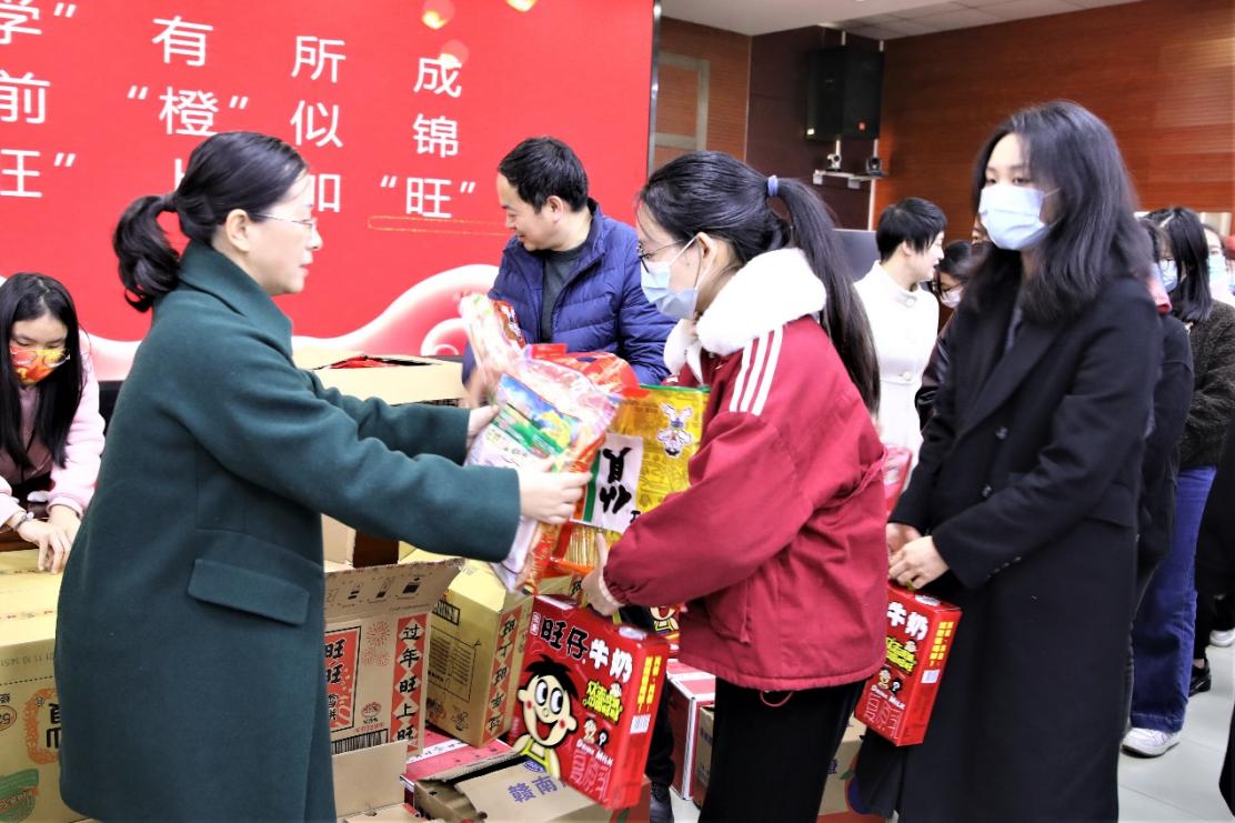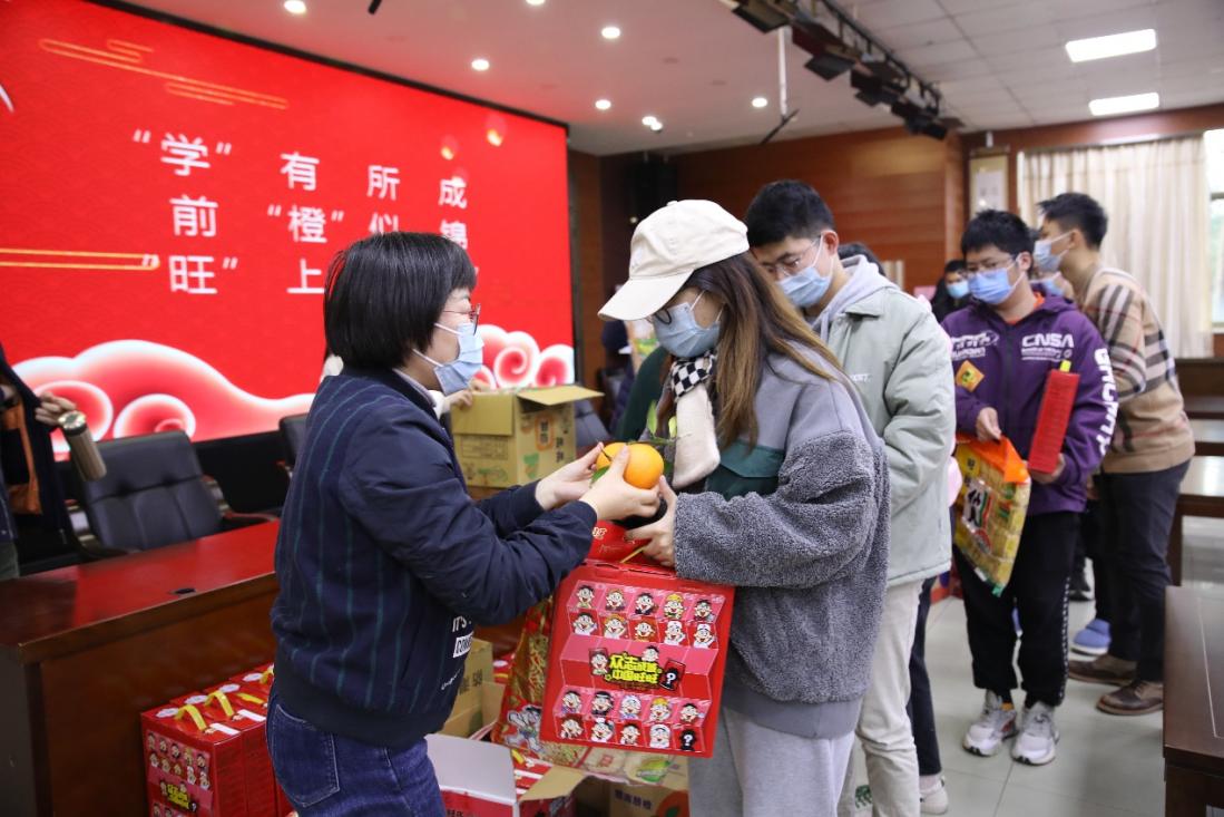 随后,领导和老师们为考研同学分发了慰问品。“学”有所成(旺旺雪饼)、前“橙”似锦(橙子)、还有能带进考场的爱心笔袋等等精致的礼物,让考研学子们感受到了学院温暖的关怀,也坚定了考研必胜的信念。