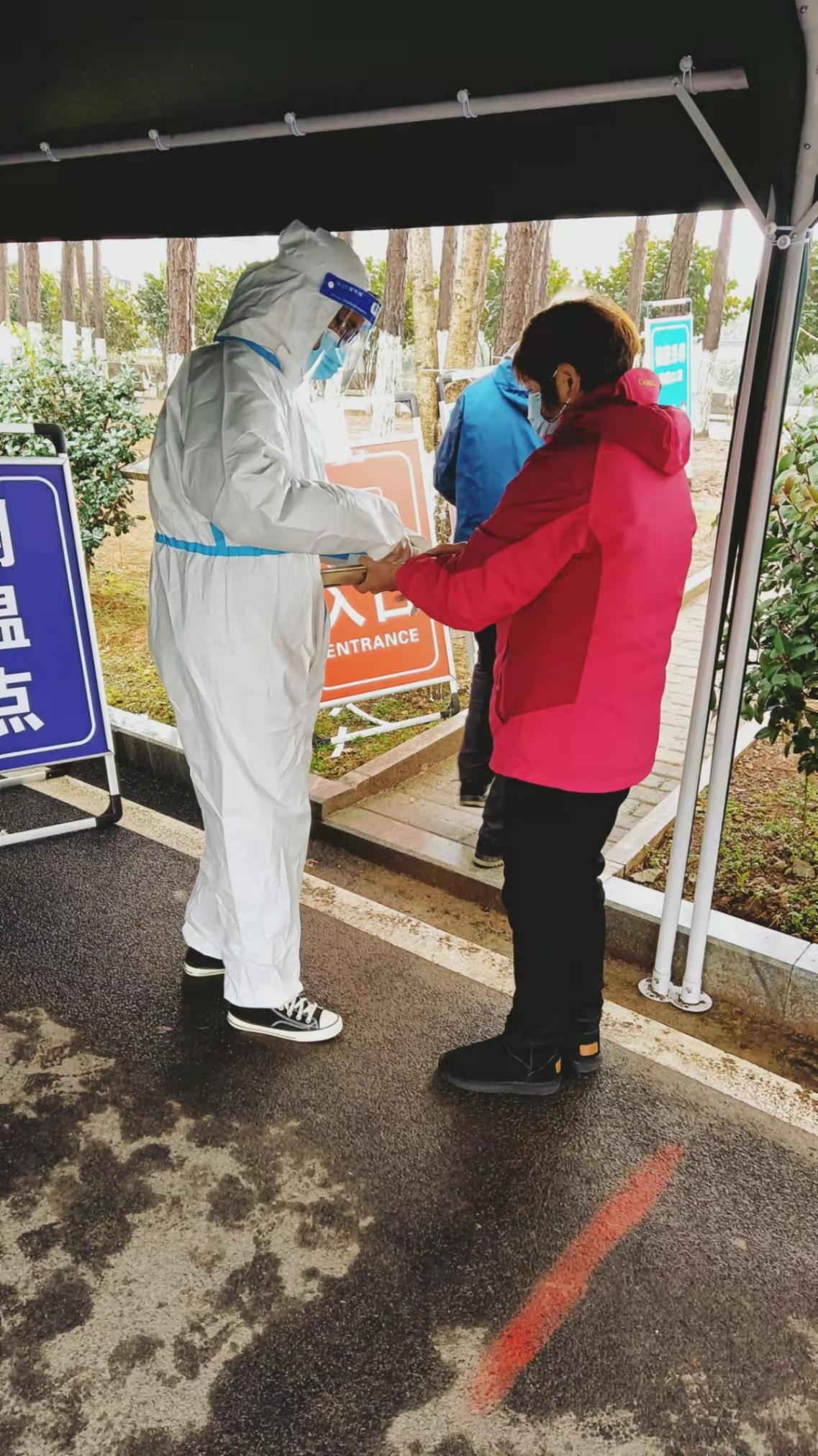 穿上防护服,教院学子站上了核酸检测的岗位,协助核酸检测前的信息登记工作。