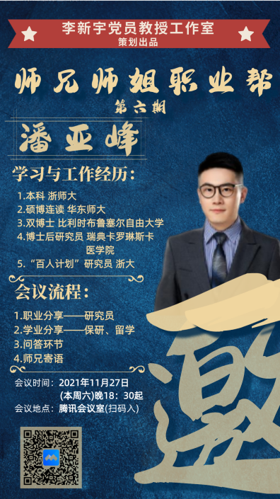 为帮助更多同学进行学习和未来求职,2021年11月27日晚,由李新宇党员教授工作室策划出品的师兄师姐“职业帮”第六期于线上举行,本次分享会请到了浙江大学“百人计划”特聘研究员,我校14级应用心理学专业毕业生——潘亚峰校友。