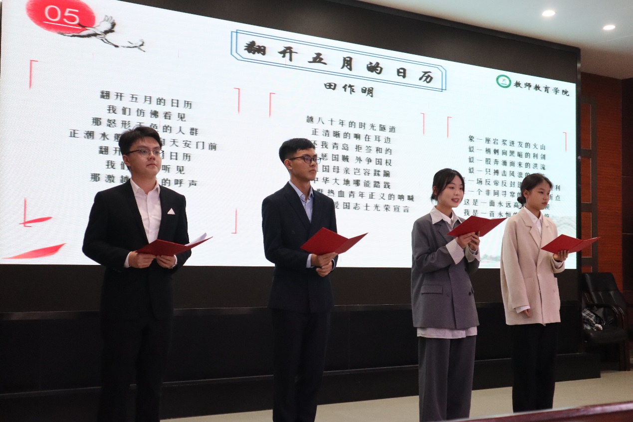 百年激情冲云霄,亿万梦想缀山川。华夏风采今胜昔,炎黄子孙谱新篇。百年来,中国共青团在中国共产党坚强的领导下,接受了血与火的考验,经历了风和雨的洗礼,取得了无数伟大业绩。为喜迎中国共青团建团100周年,展现教院学子爱国之情与独特风采,5月20日晚,我院“青春如诗,百年芳华”经典诗文朗诵赛决赛在17幢112报告厅顺利进行。