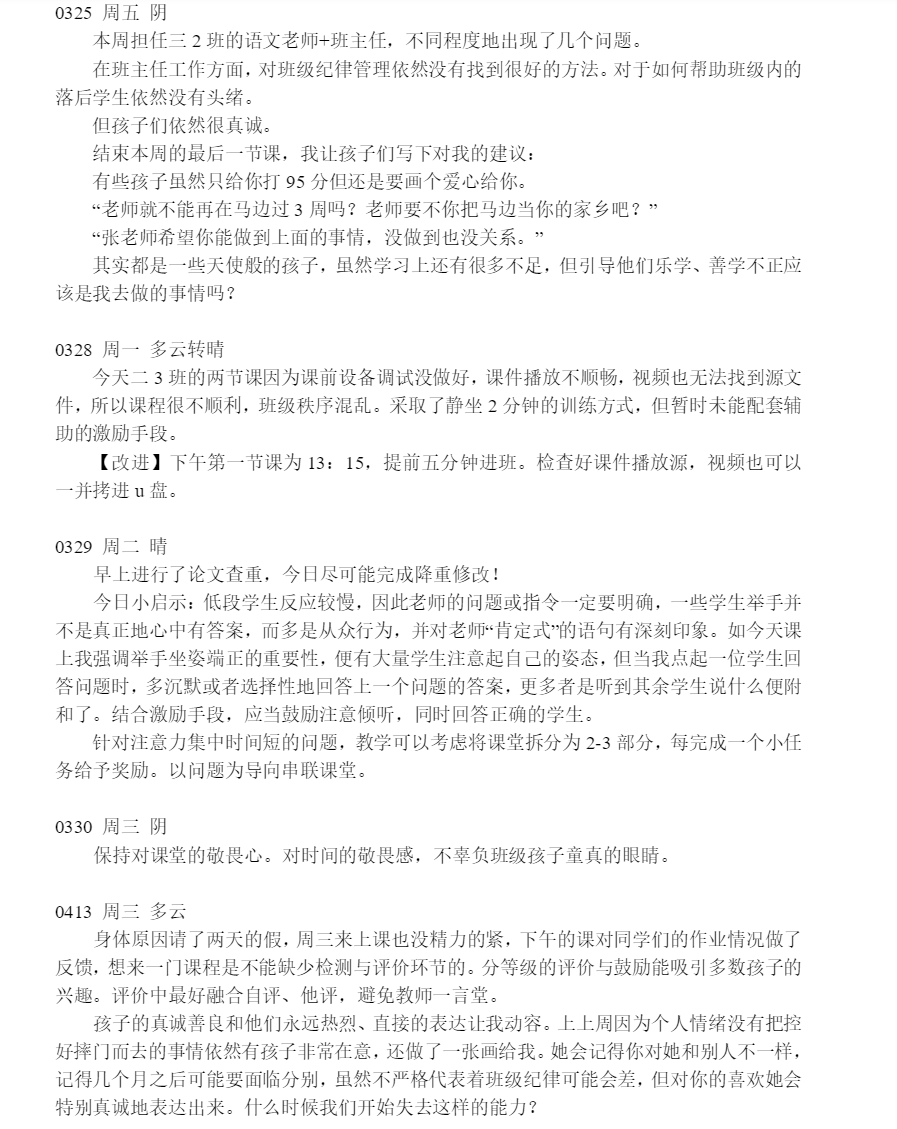 对于可能看起来易怒调皮的孩子,张思睿在她的日记中记下了这样一件事:“两名学生想打架,班里同学劝阻并告知我,在你一言她一语中我大致知道了是橙色衣服男孩先动的手,于是我一边抚摸他的手试图安抚其情绪,一边反复问他到底发生了什么,如果有委屈可以告诉老师,但如果你做错了就要道歉。可能重复了有五六遍,他原本一直躁动的身体慢慢冷静下来,我带他到班里同学不多的地方再次询问,他承认了错误并且答应要去道歉,也怯怯地问我办公室在哪里,能不能以后有事情都来找我。我触动不已,也更相信这次支教的意义。”教育是有韧性的,正如张思睿感悟的那样,看似是“坏”的孩子们并不是真正的“坏”,他们可能只是缺少关注和关爱,所以在行为上表现出冲动、易怒,简单的外显行为在事实上投射出其内心被关注的需求,“所以学生信任我、喜欢我,是一件非常能鼓舞人的事情”。