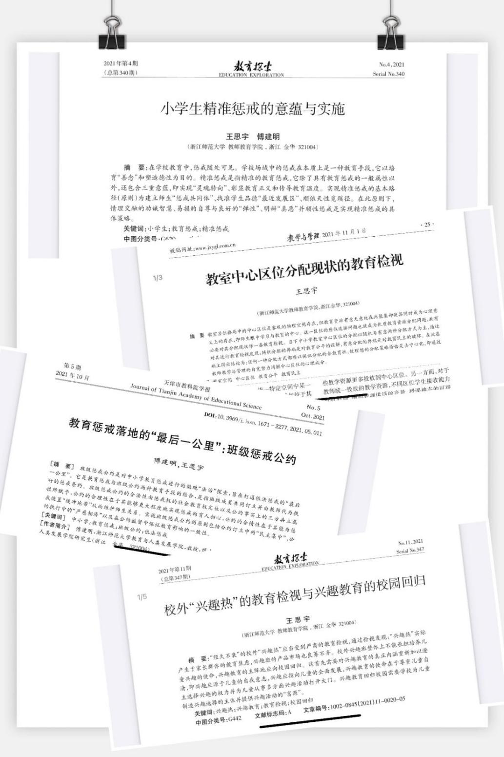 王思宇的研究方向为教育基本理论与教育哲学。在学期间,他曾获浙江师范大学学业一等奖学金,以第一、第二及独立作者身份在《教育探索》《教学与管理》《现代中小学教育》《天津市教科院学报》等核心期刊发表论文5篇,并参与编写、修订导师傅建明教授的专著《小学教育基础》《教师专业成长途径与方法》等。