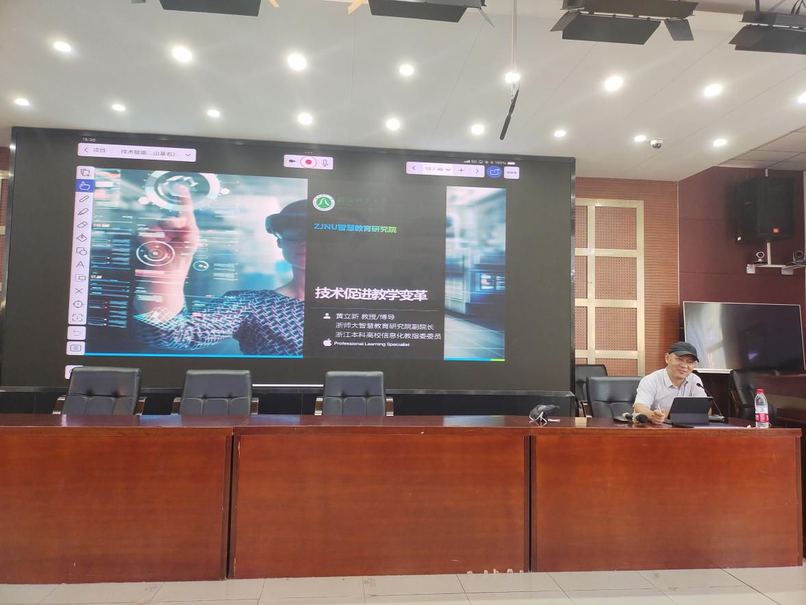 开班典礼后,浙江师范大学智慧教育研究院副院长黄立新教授作《技术促进教学变革》专题讲座。黄教授从活力之基、活力之路、活力之果三个方面来讲述技术发展如何促进教学变革。黄老师以诗意又不乏幽默的讲述,深深感染了在座的每一位教师。会后,教师们展开了热烈讨论,进一步明确了在开展项目化学习过程中信息技术的重要作用。