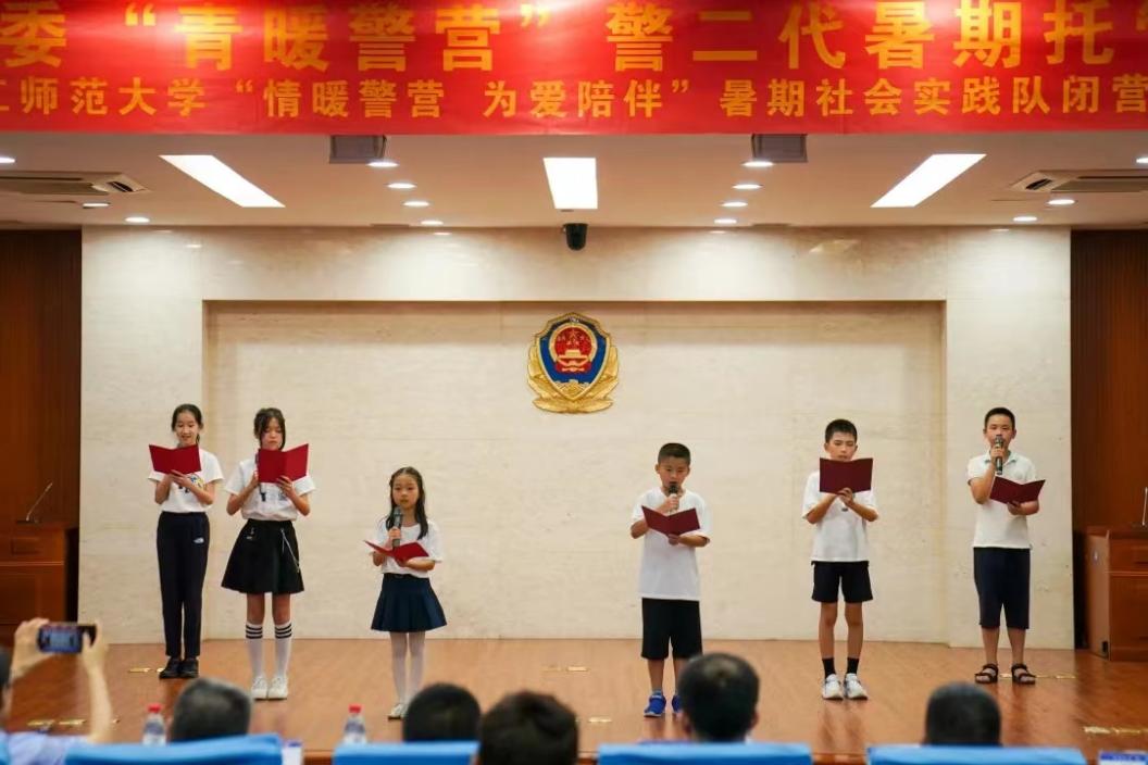 7月15日,夏令营活动接近尾声,金华市公安局团委“青暖警营”警二代暑期托管班汇报演出暨浙江师范大学“情暖警营,为爱陪伴”暑期社会实践队闭营仪式在金华市公安局报告厅隆重举行。实践队员与小朋友们认真排练,为一线人民警察带来了一场精彩演出,现场气氛热烈,笑语不断。小教213班张磊同学与实践队员一起向观众交出《一张考卷》,家长与孩子沉浸于表演,在欢乐小品《一张考卷》中体会家庭的和谐温暖。