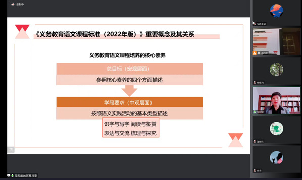 活动由课程与教学系副主任陈法宝主持。《学科课标研究与教材研究》课程主讲教师王国均老师、杨继利老师、俞向军老师,汉语言文学(师范)本科生,学科教学(语文)专业硕士研究生,以及包括宁波余姚陆埠镇中语文教研组等一线语文教师300余人,通过线上和线下结合的方式参与了此次活动。