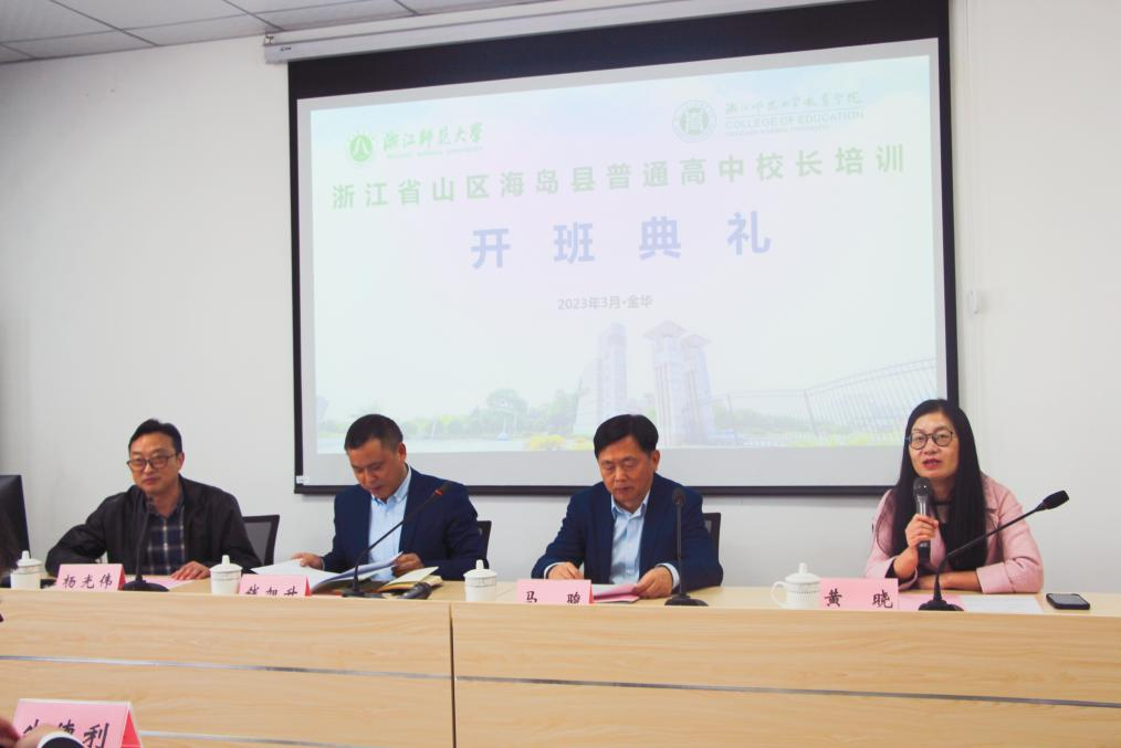 2023年3月8日上午,为深化山海协作,共同建设教育现代化,来自浙江省山区26县及海岛县的30位高中校长在17幢718教室齐聚一堂,浙江省教育厅教师工作处三级调研员马骏、浙师大继续教育与合作办学管理处处长钱旭升、浙师大教育学院院长黄晓出席开班典礼,开班仪式由浙师大教育学院社会服务中心主任杨光伟主持。