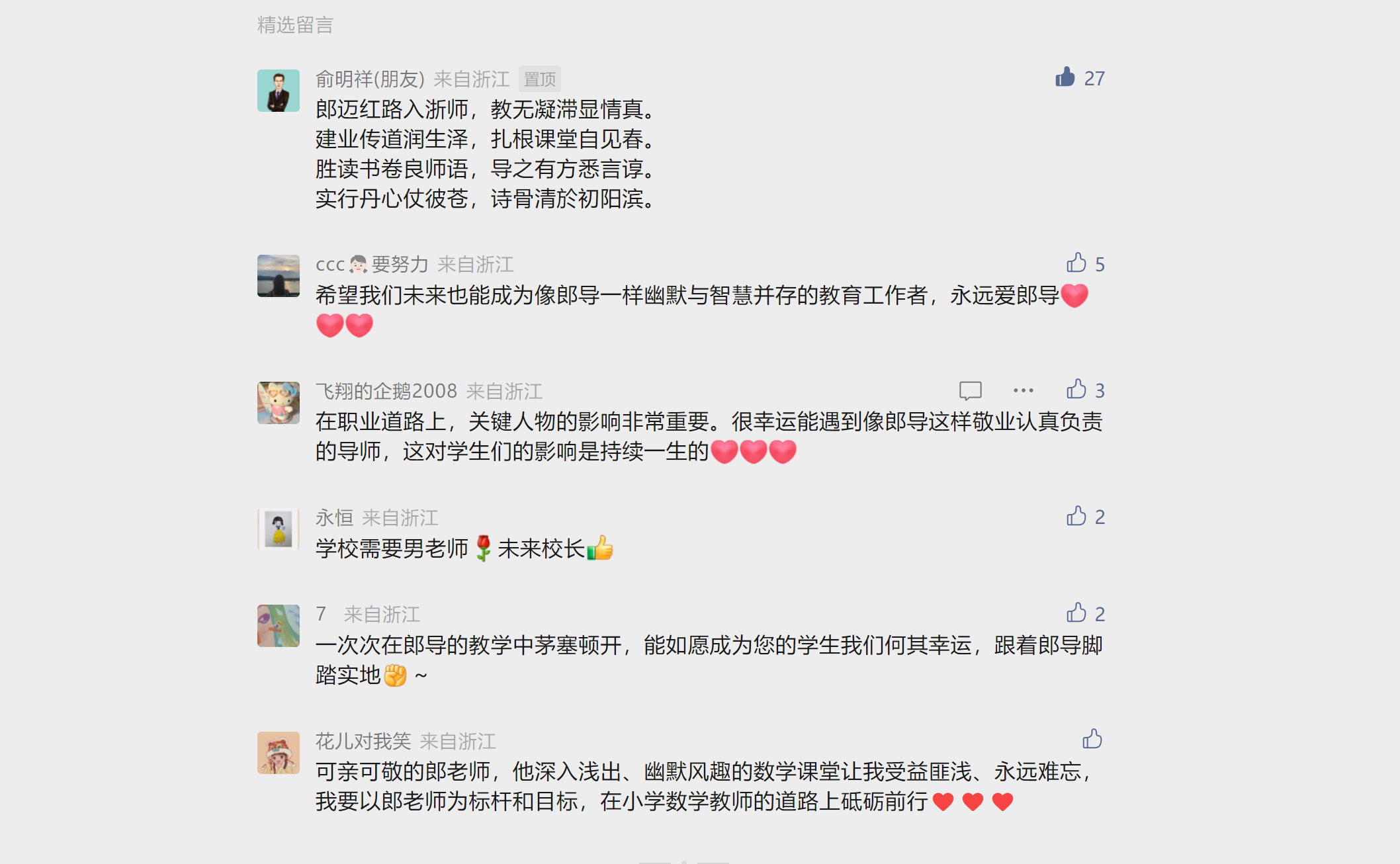 刚来学校,见到了班主任郎建胜老师,惊喜地发现我的班主任竟然是有非常丰富教学经验的男老师,更是浙江省的小学数学特级教师。渐渐地,我发现郎老师好像把我们当成了小学生,或者说是他的孩子。