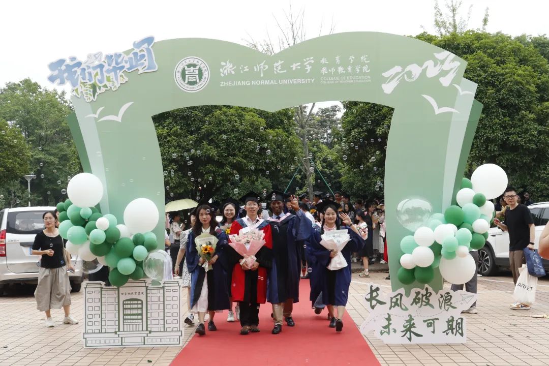 毕业生们在导师、班主任的带领下走上红毯,跨过教育之门,并在笑脸墙前合影留念。恩师、挚友、他们,无数的欢笑与泪水,皆收录进一本名为“青春”的诗集,记录着大家的成长与收获。场内《栀子花开》MV循环播放,大家共忆在师大的点点滴滴。