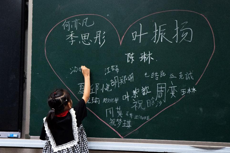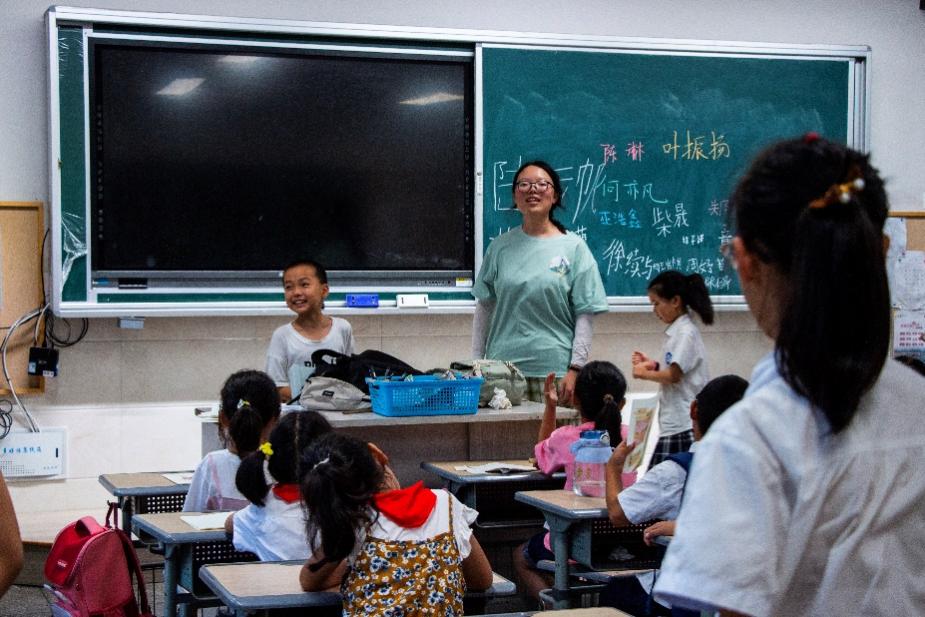 随着实践队小老师们一个个上台,台下的孩子们也激动不已,一张张小脸蛋上都洋溢起幸福的笑容。满满童心充满教学楼,欢声笑语飞扬教室。实践队教学组老师迅速与孩子们打成一片。稚嫩的童声与老师们的教导交融在一起,构成一幅夏日的最美画卷。