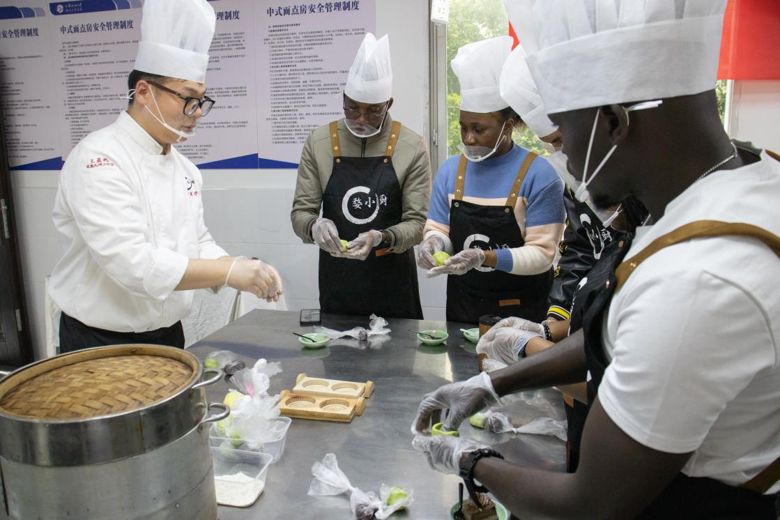 随后,讲解员带领留学生们来到中式面点实训室。为了增加互动性和趣味性,讲解员以有奖问答的形式向大家介绍了清明节的由来和习俗。