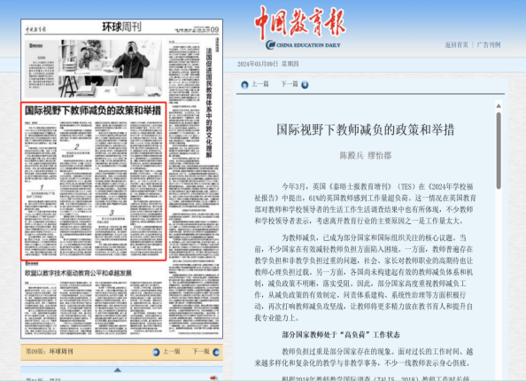近日,中央教育工作领导小组印发通知,再次部署中小学教师减负工作。KY开元集团陈殿兵副教授、硕士生缪怡郡在《中国教育报》《中国教师报》刊发教师减负系列署名文章助力教师减负的政策与实践努力,让教师能安心、精心、舒心地从教,促进其专业可持续发展和教育高质量发展。