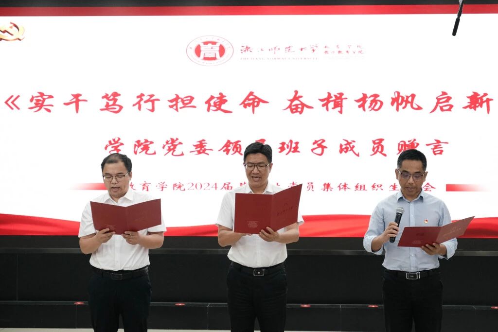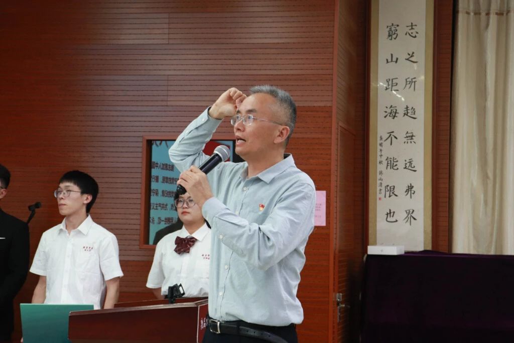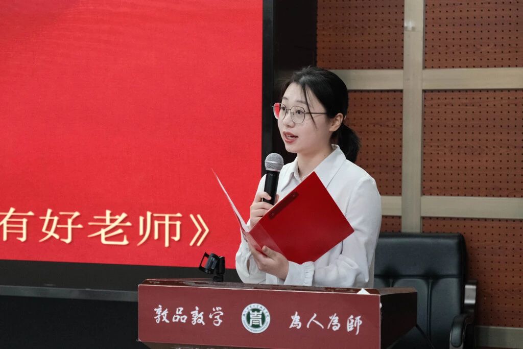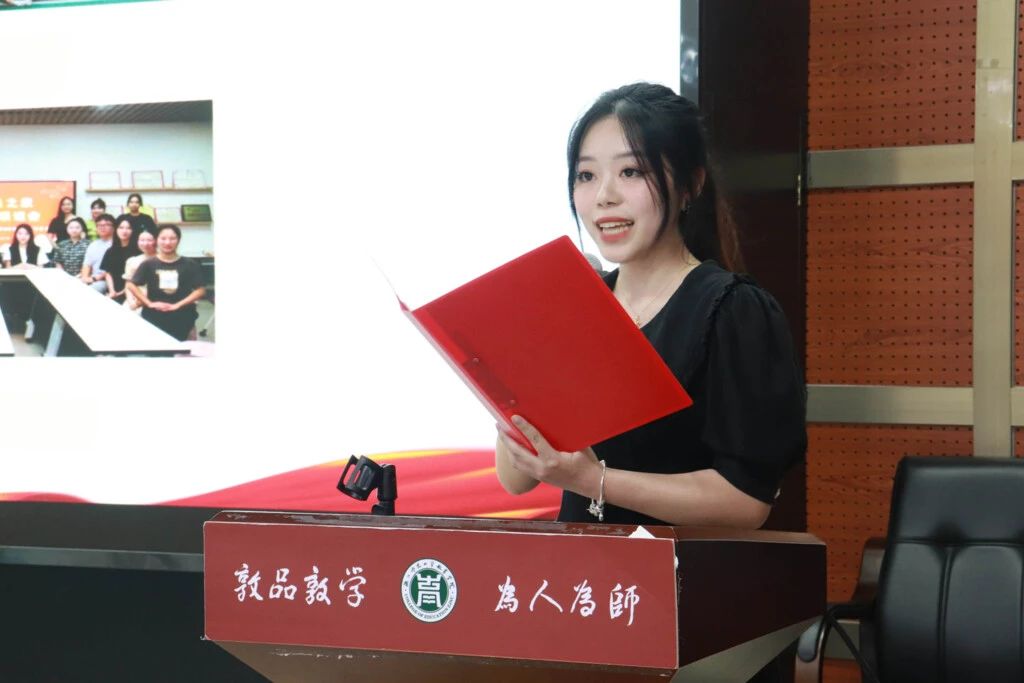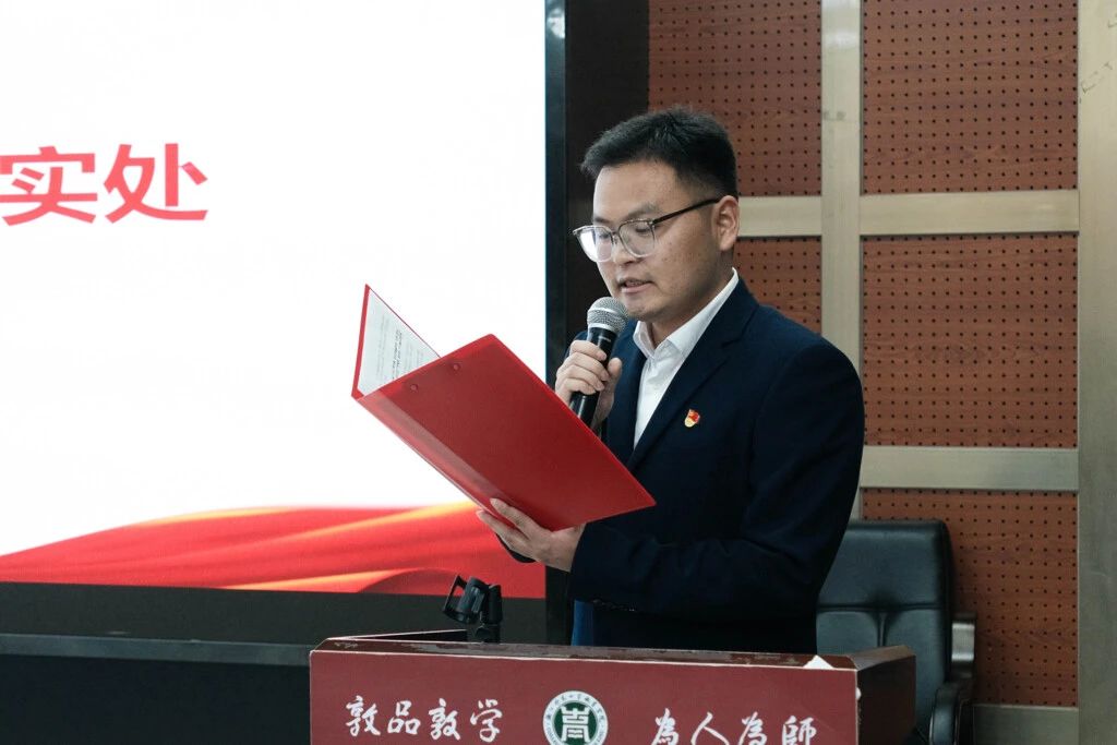 优秀毕业生党员代表施懿宣读了《争做新时代“四有”好老师、育人“大先生”》的倡议,呼吁毕业生党员以教育家精神为航标,以崇高师德为前行灯塔,争做新时代“四有”好老师。