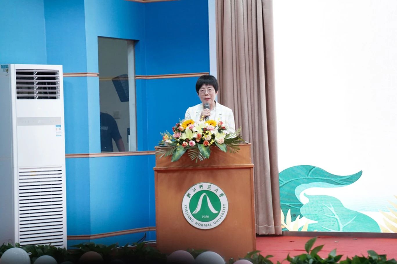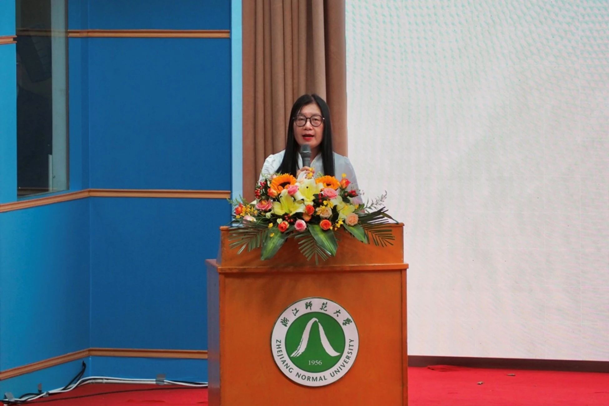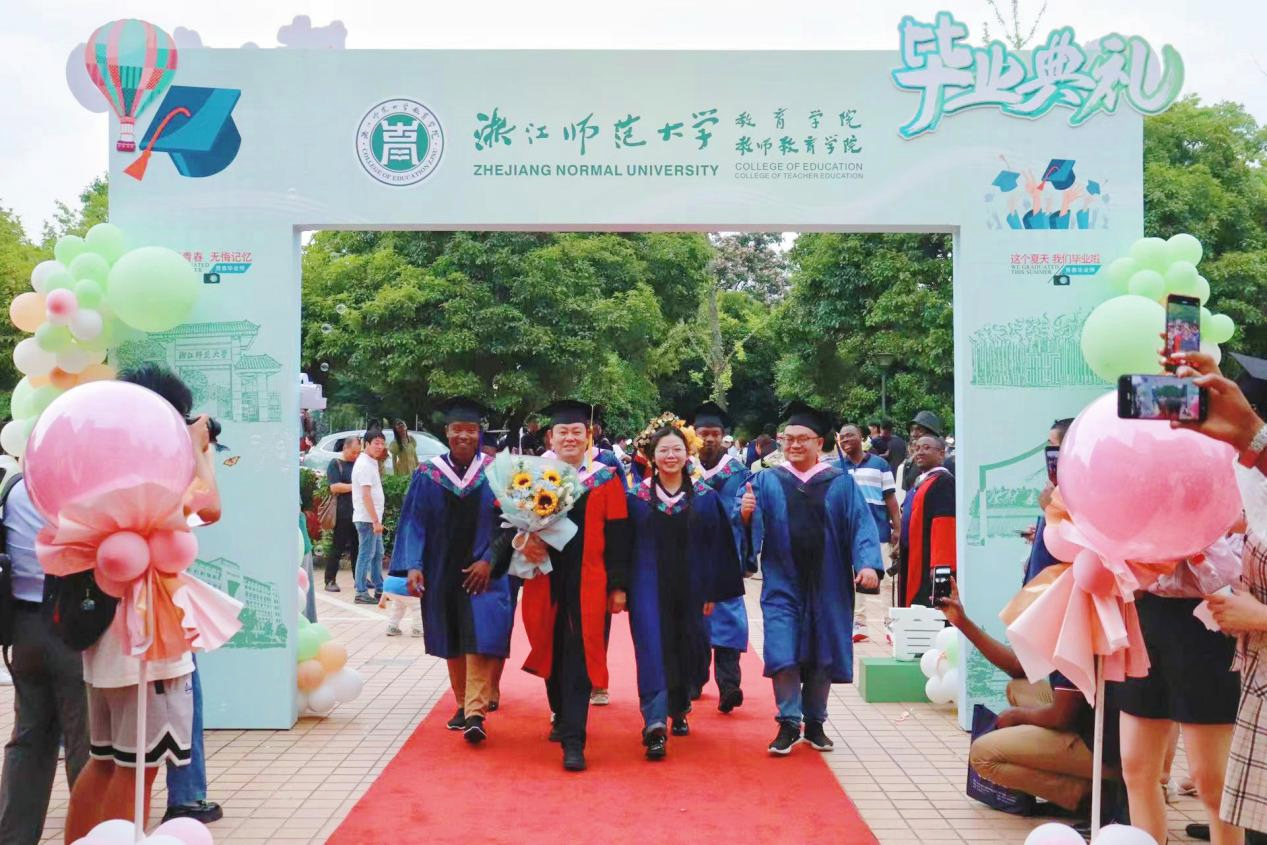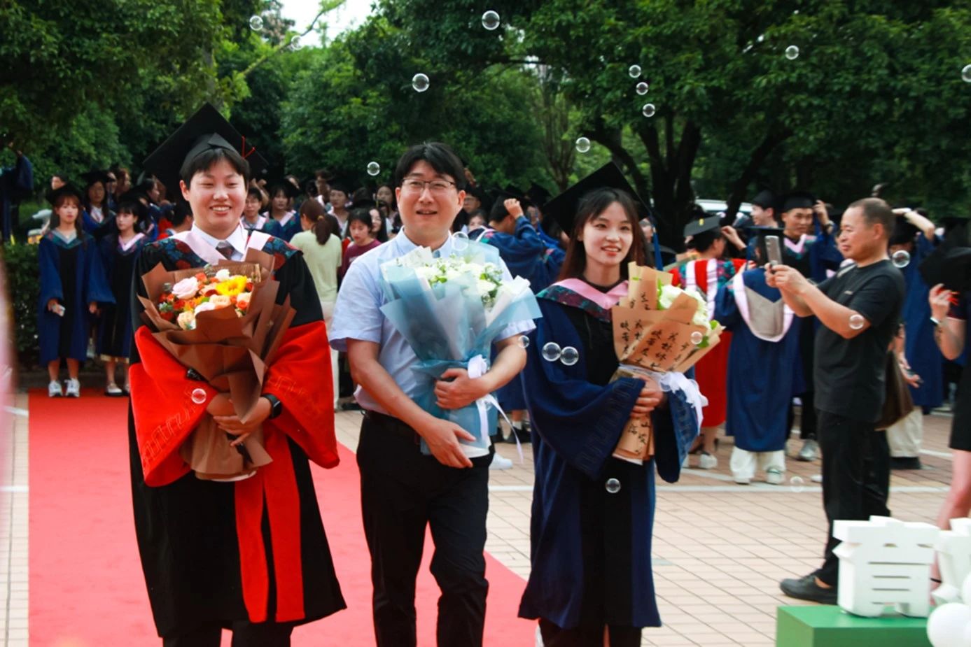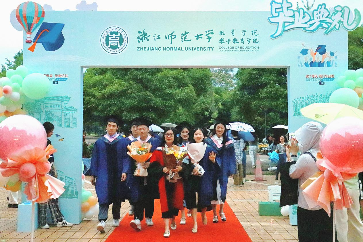 毕业生们在导师、班主任的带领下走上红毯,跨过教育之门,并在签名墙前合影留念。告别昔日的稚嫩,留下藏匿温情的四季,此刻,大家就让工作人员把美好定格在瞬间。场内视频播放着大家在浙师的点点滴滴,帧帧光影是凝结在心头的笑容与泪水。