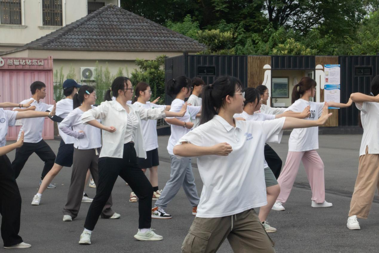 每天清晨和傍晚,大家练习太极拳、八段锦、中式养生操、消气操、五禽戏等养生操,或开启高效、愉快的一天,或放松身心、缓解一天的疲劳,从而以更好的状态参加各项实践活动。