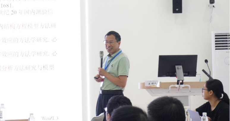 温忠麟作了题为《我的学术之路——简单化与精确化的追求》的报告,分享了他丰富的学术探索经历。温教授详细介绍了他在中介效应、结构方程、调节效应、纵向数据分析等领域的重要论文和著作,展示了他在这些领域的深入研究和卓越贡献。在报告中,他巧妙地运用中国传统谚语“种瓜得瓜,种豆得豆”和“南橘北枳”,强调了调节效应在变量关系中的作用,指出这种效应可能导致变量间关系的强弱变化,从而需要我们重新审视所谓的“可重复性危机”。他认为,教育、心理研究不应过分担心结果的可重复性。相反,社会科学研究应当鼓励不同地域(包括不同文化、人种等)的研究者进行重复研究,以验证和丰富理论的普适性和适用性。