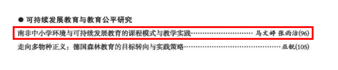 文章进一步指出,南非环境与可持续发展教育以生态维度为基础,融合在社会维度和经济维度的发展议程中,因此并未局限在学校单一场域,而是形成政府机构、社会组织和中小学校共同参与的“三方协作”的特征。随着可持续发展科学领域的不断进步和新知识的涌现,南非中小学环境与可持续发展教育日益注重生态系统和社会系统的关联性。这一实践取向推动南非中小学教学与学习的变革行动,促进更加积极主动的教与学。