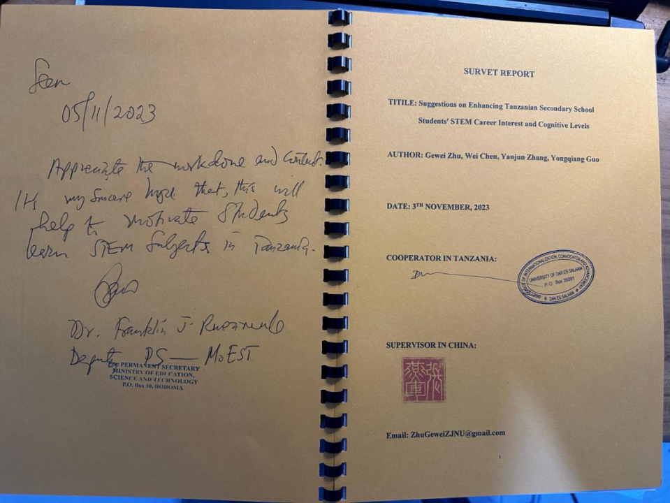 “实证研究,就是用数据说话。”祝歌伟将自然科学的研究方法引入人文社科领域,使研究更加立体和有说服力。带着3358份纸质问卷和50余人次的学生、教师和校长的访谈成果,他们以调研数据为支撑撰写的《关于提升坦桑尼亚中学生STEM职业兴趣及职业认知水平的建议》资政报告被坦桑尼亚教育与科技部采纳,并获得坦桑尼亚教育与科技部代理部长的肯定性批示。回忆起面见教育部代理部长时的场景,祝歌伟十分感慨,“感觉所做的事情特别有意义。”